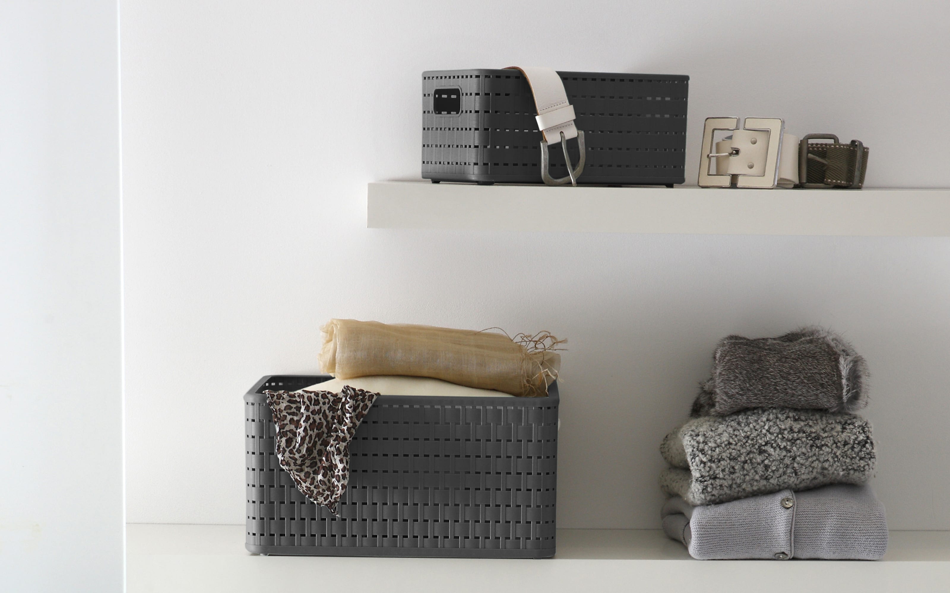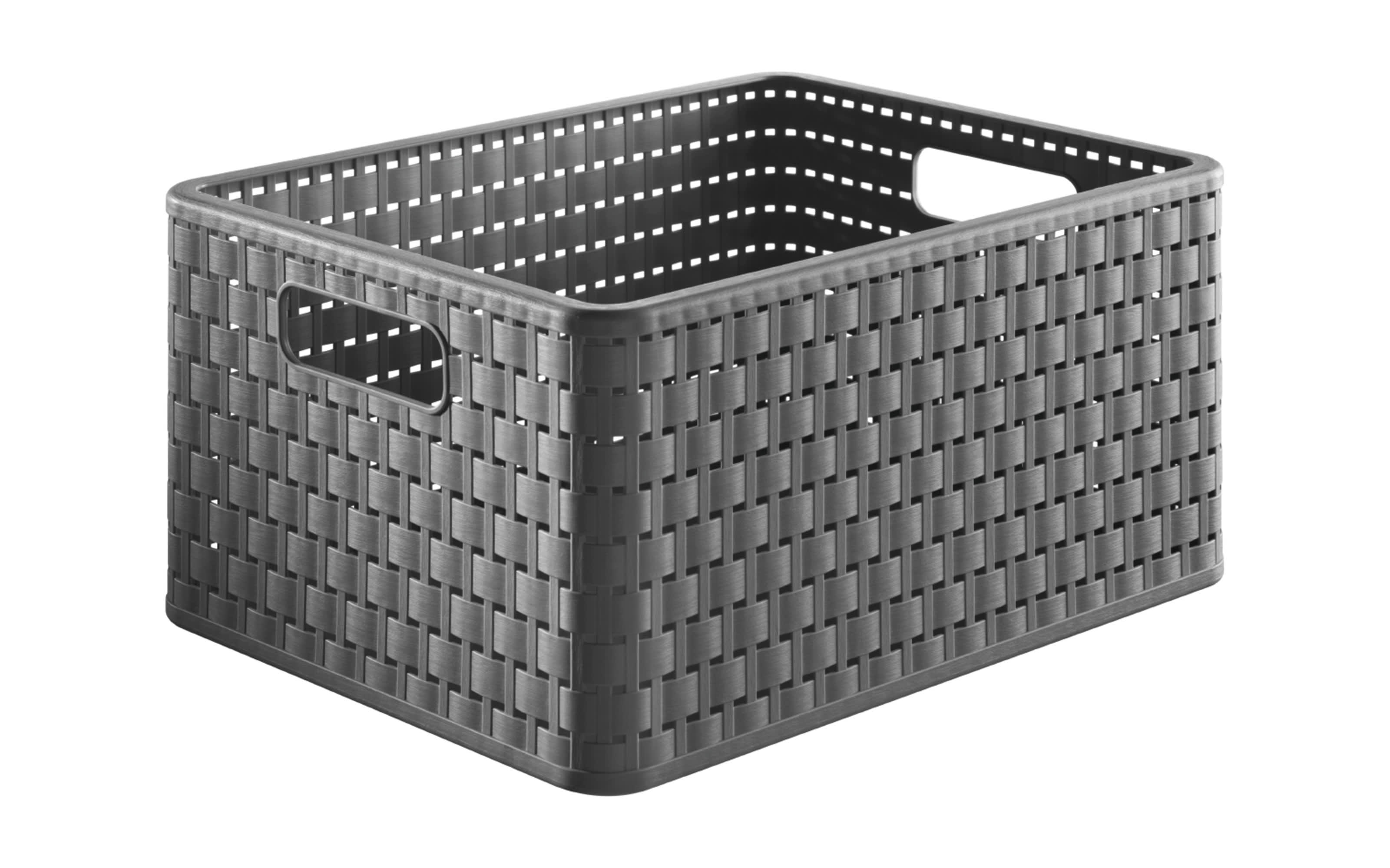 Aufbewahrungskorb mit Rattan-Nachbildung in anthrazit, beispielsweise einsetzbar als Kinder-Spielzeugkiste, Ordnungssystem für den Vorratsraum oder in Bad und Küche, platzsparend stapelbar.