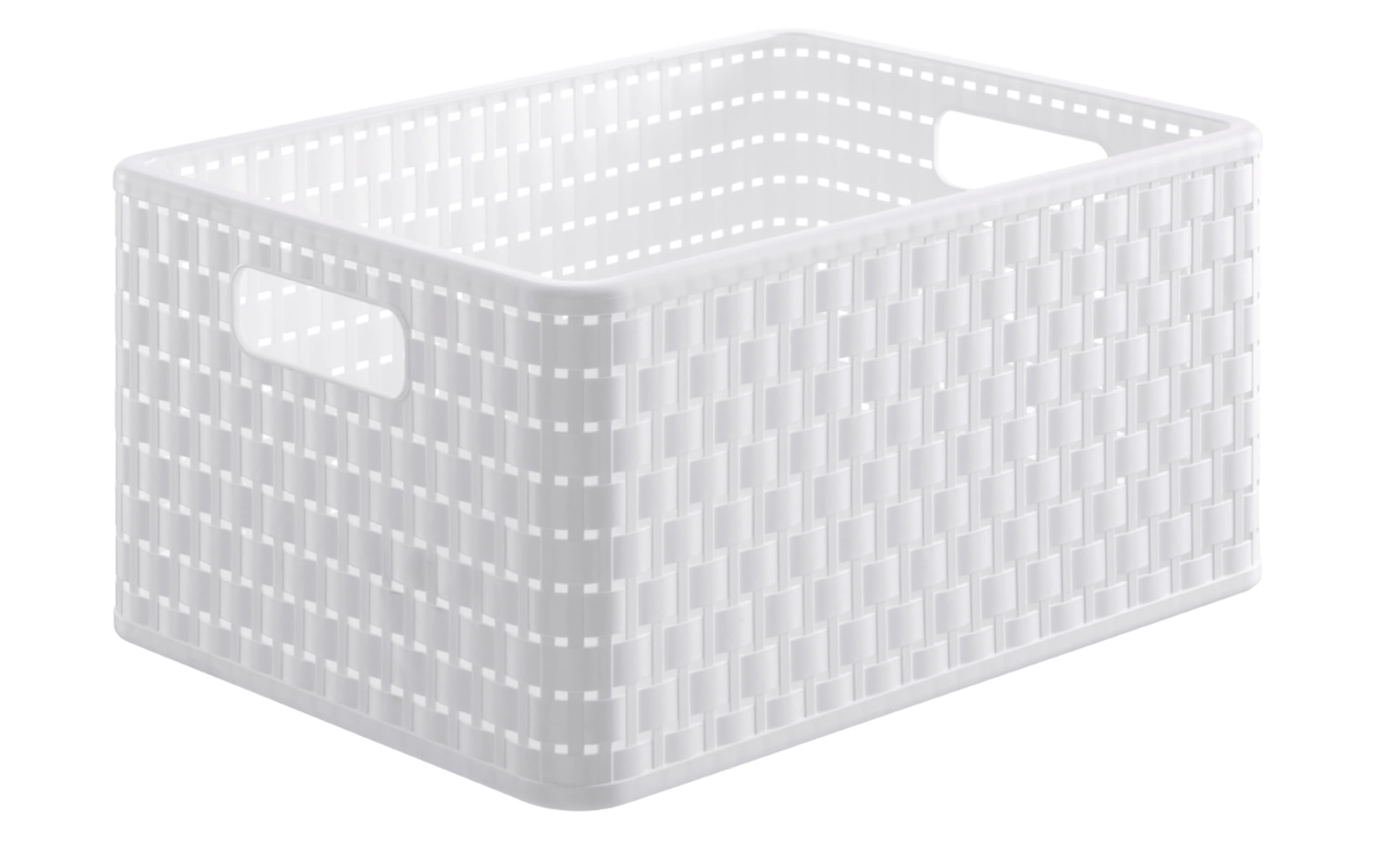 Aufbewahrungskorb mit Rattan-Nachbildung in weiß, beispielsweise einsetzbar als Kinder-Spielzeugkiste, Ordnungssystem für den Vorratsraum oder in Bad und Küche, platzsparend stapelbar.