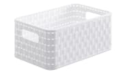 Aufbewahrungskorb mit Rattan-Nachbildung in weiß, vielseitig einsetzbar ob für das Bad, Bücherregal oder Kinderzimmer, platzsparend stapelbar.