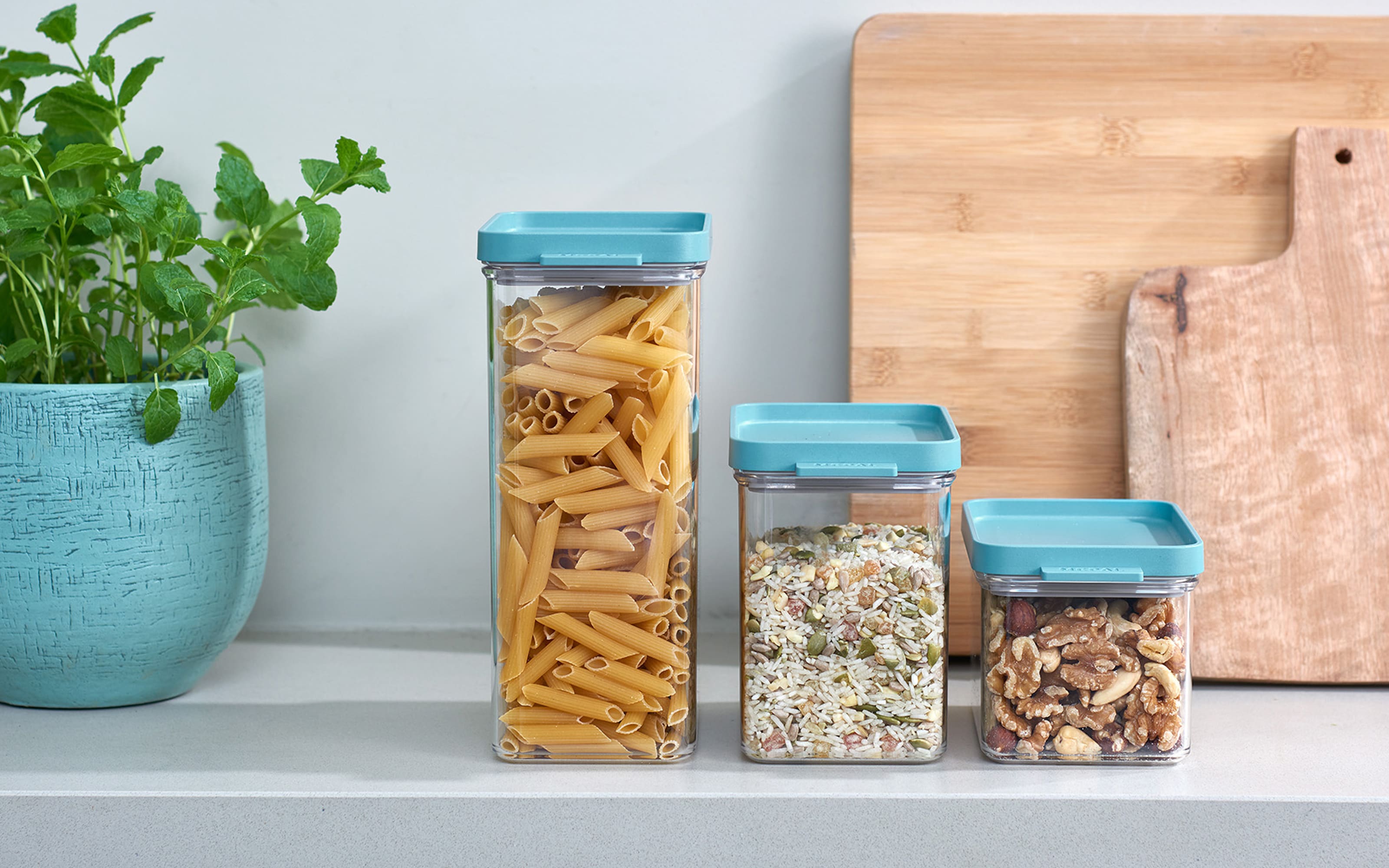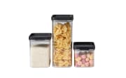 3-teiliges Vorratsdosen Set aus langlebigem Kunststoff, BPA-frei und lebensmittelecht. Der Deckel verschließt luftdicht und die Dosen sind praktisch stapelbar.