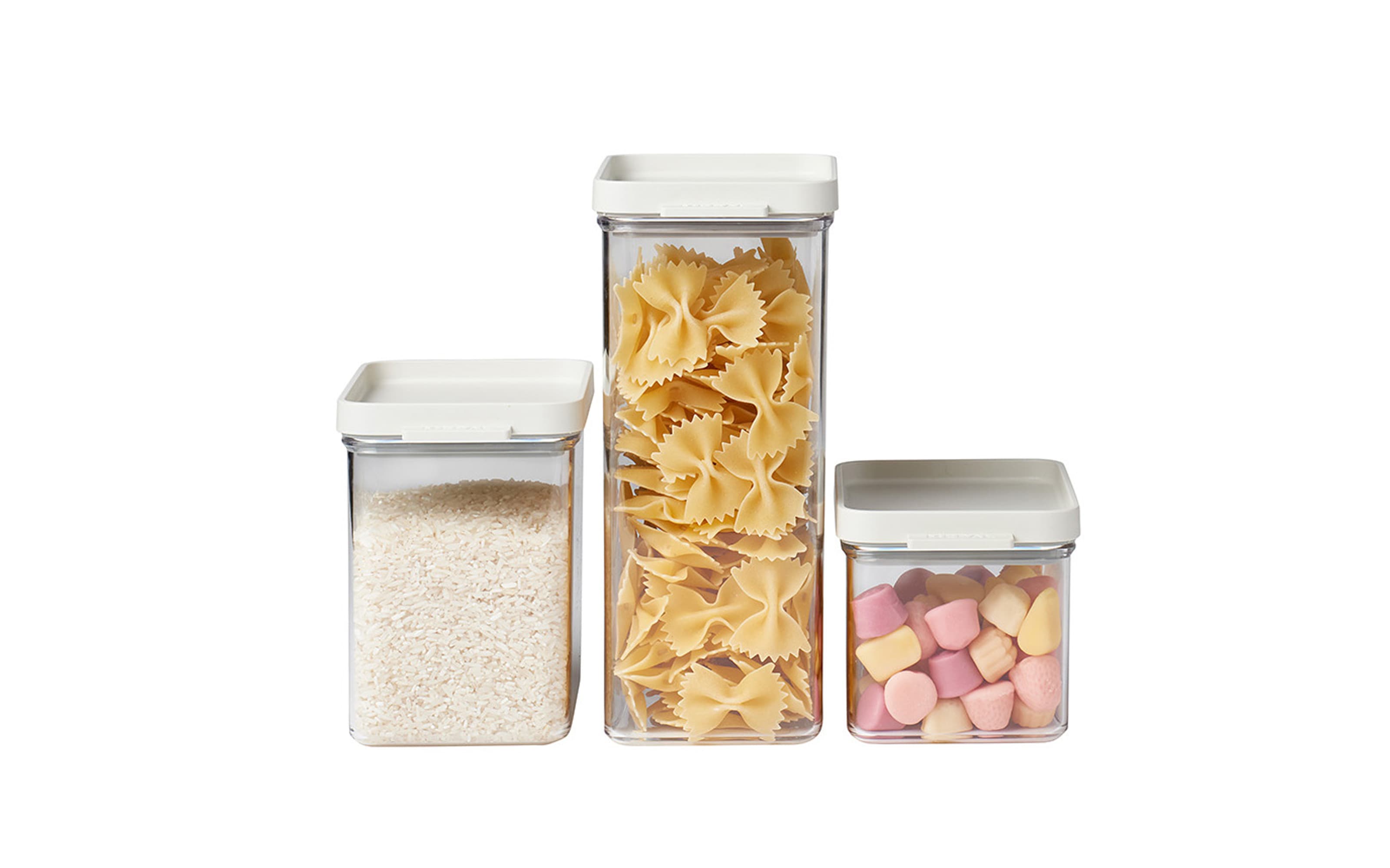 3-teiliges Vorratsdosen Set aus langlebigem Kunststoff, BPA-frei und lebensmittelecht. Der Deckel verschließt luftdicht und die Dosen sind praktisch stapelbar.