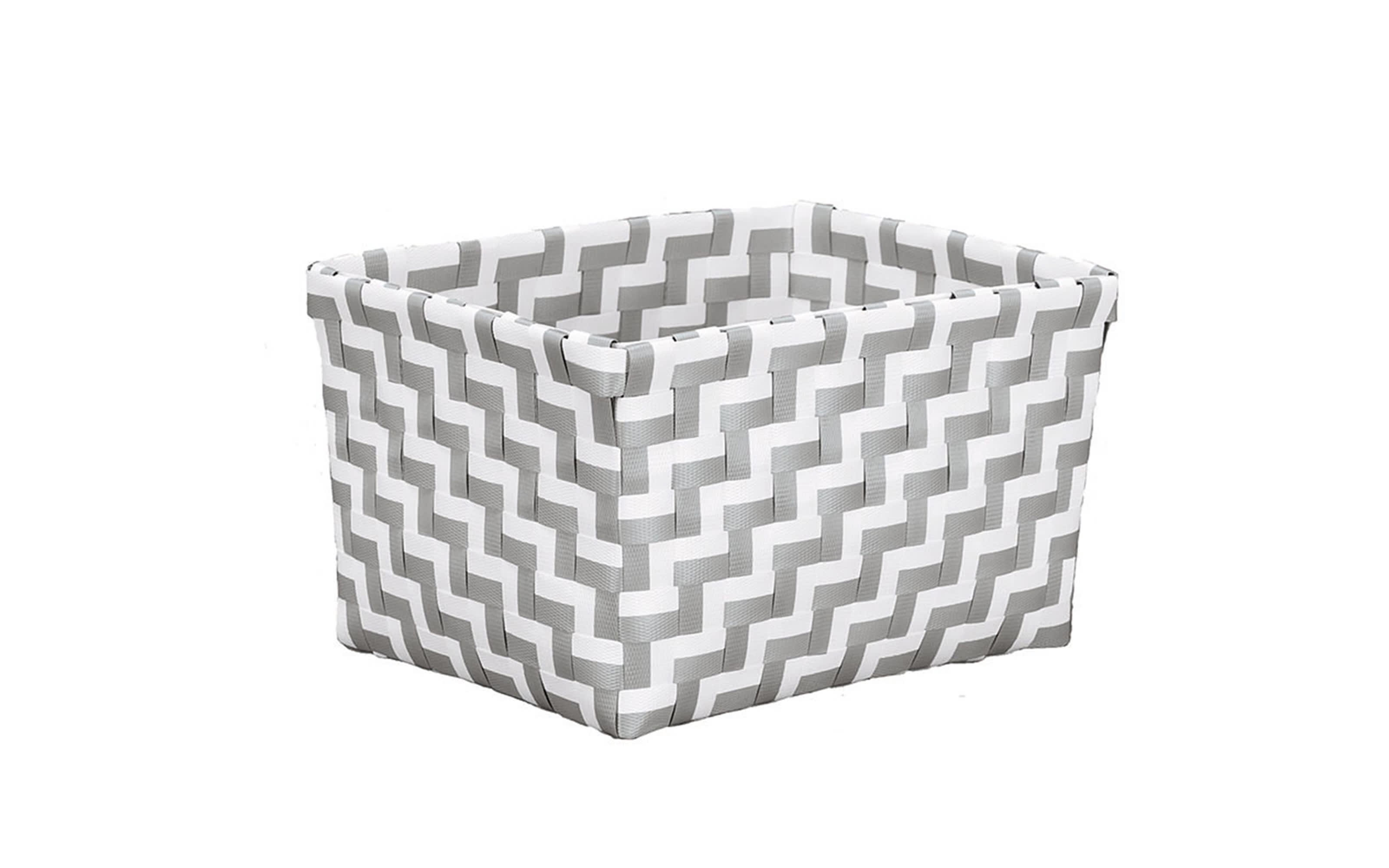 Aufbewahrungsbox aus geflochtenem Kunststoff in platin, ideal für Badezimmerutensilien oder als Ordnungssystem für Regale und Schubladen.