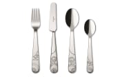Das Kinderbesteck aus rostfreiem Edelstahl überzeugt mit geprägten Dekorelementen.