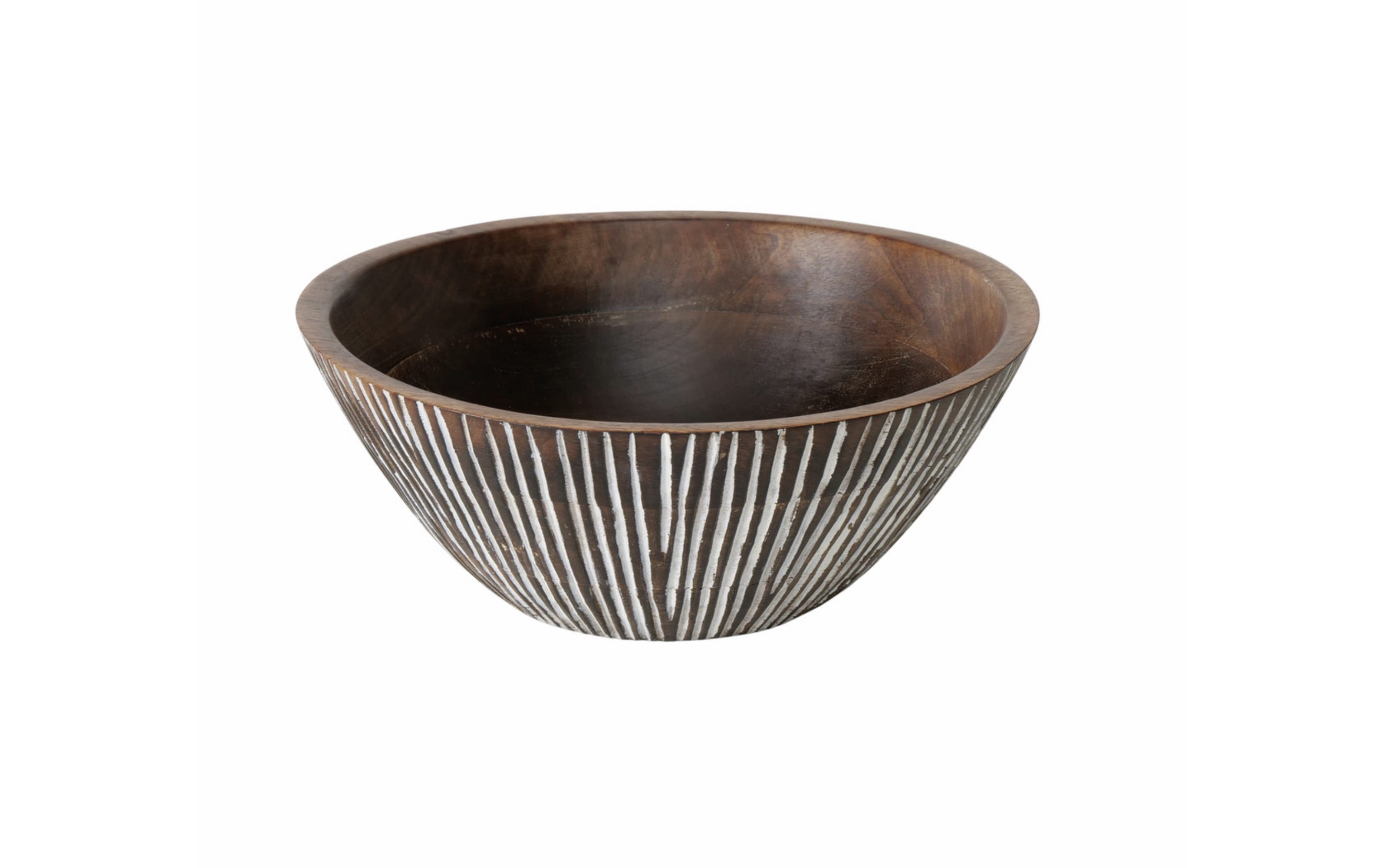 Die Schale Riffley besteht aus hochwertigem Mangoholz in braun und hat weiße Dekorstreifen, sie überzeugt durch ihr natürliches Design,