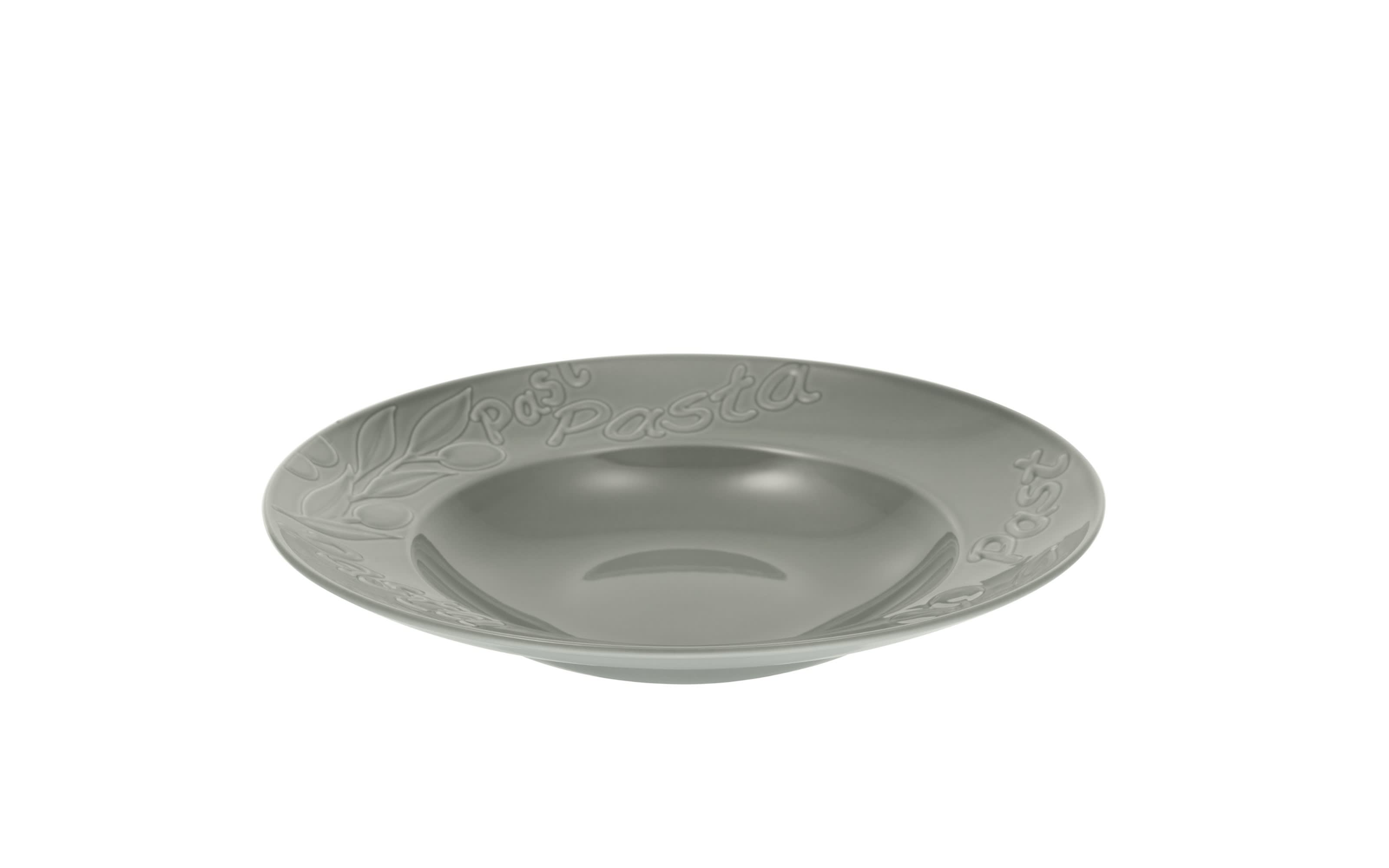 Dieser Pastateller aus Porzellan, in stone mit Oliven Motiv, ist ein Highlight auf jedem Tisch,