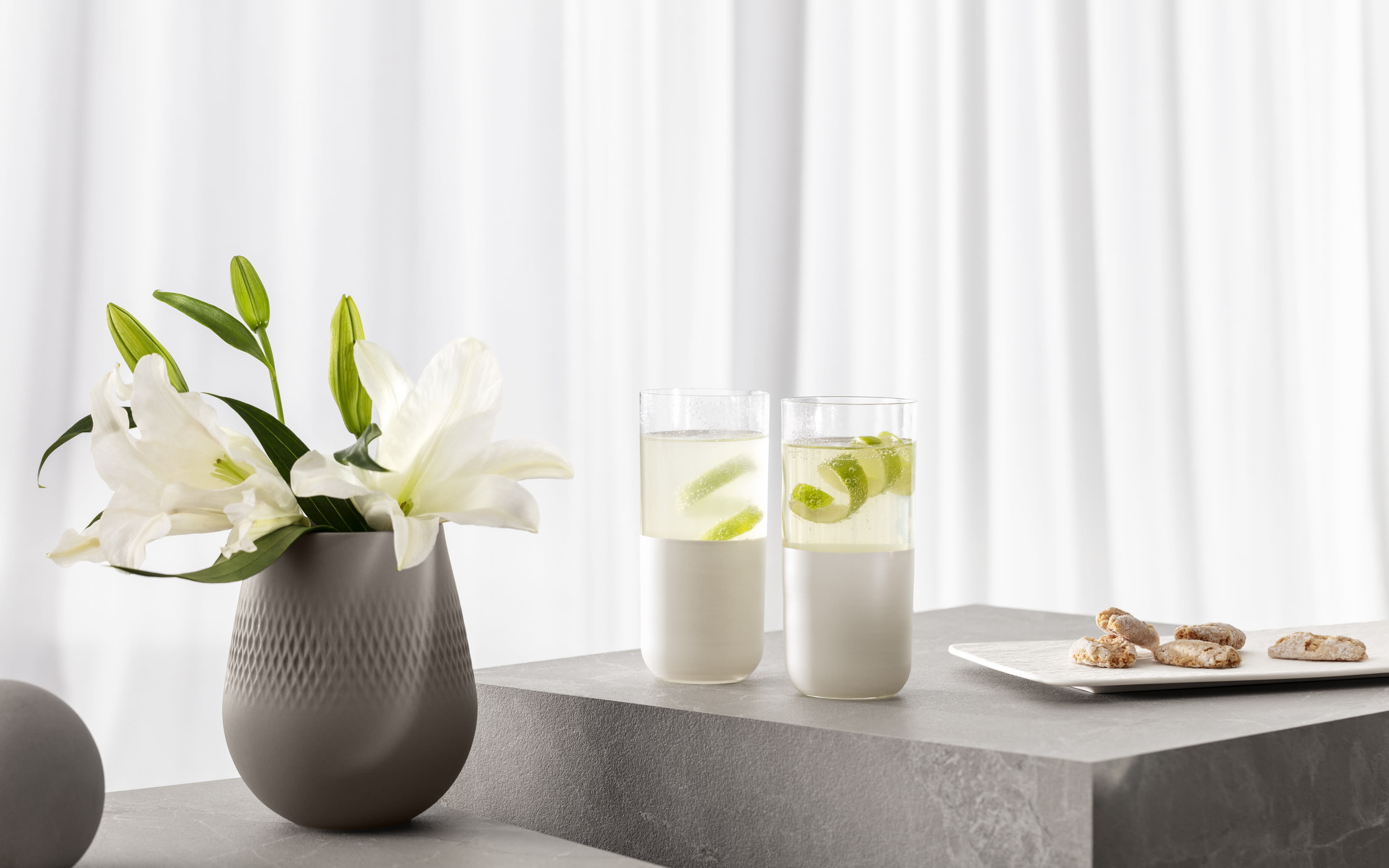 Die Gläser bestechen durch ihren unteren mattweißen Bereich und verleihen der Tafel einen eleganten Look, fügen sich harmonisch in die Tischdekoration ein und sorgen für ganz besondere Dinner-Momente.