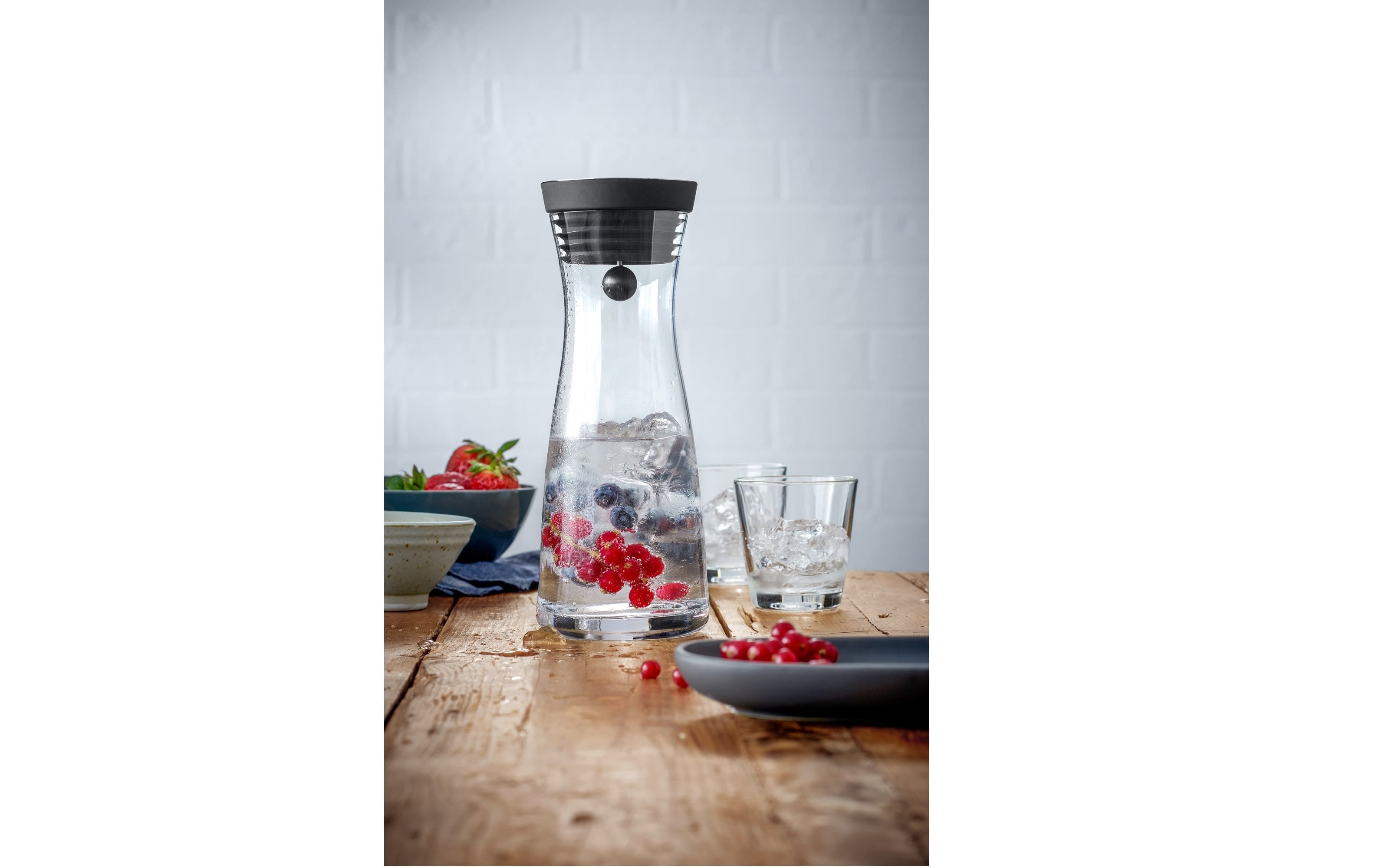 Diese Wasserkaraffe besteht aus Glas und der Verschluss ist mit einem Silikonrand und Close-Up Mechanismus versehen, der ein einfaches und müheloses Ausschenken ermöglicht, ohne das etwaiger Inhalt in das Glas gerät. Die Metallbestandteile sind aus Cromargan Edelstahl rostfrei 18/10 gefertigt und der Deckel lässt sich für das einfache Reinigen zerlegen.