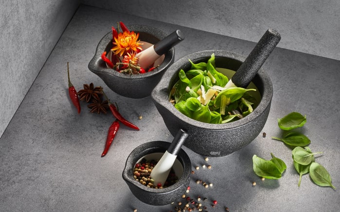 Dieser wunderschöne Mörser aus edlem Porzellan in schwarz eignet sich perfekt zur Herstellung von Pesto,