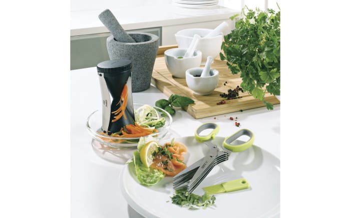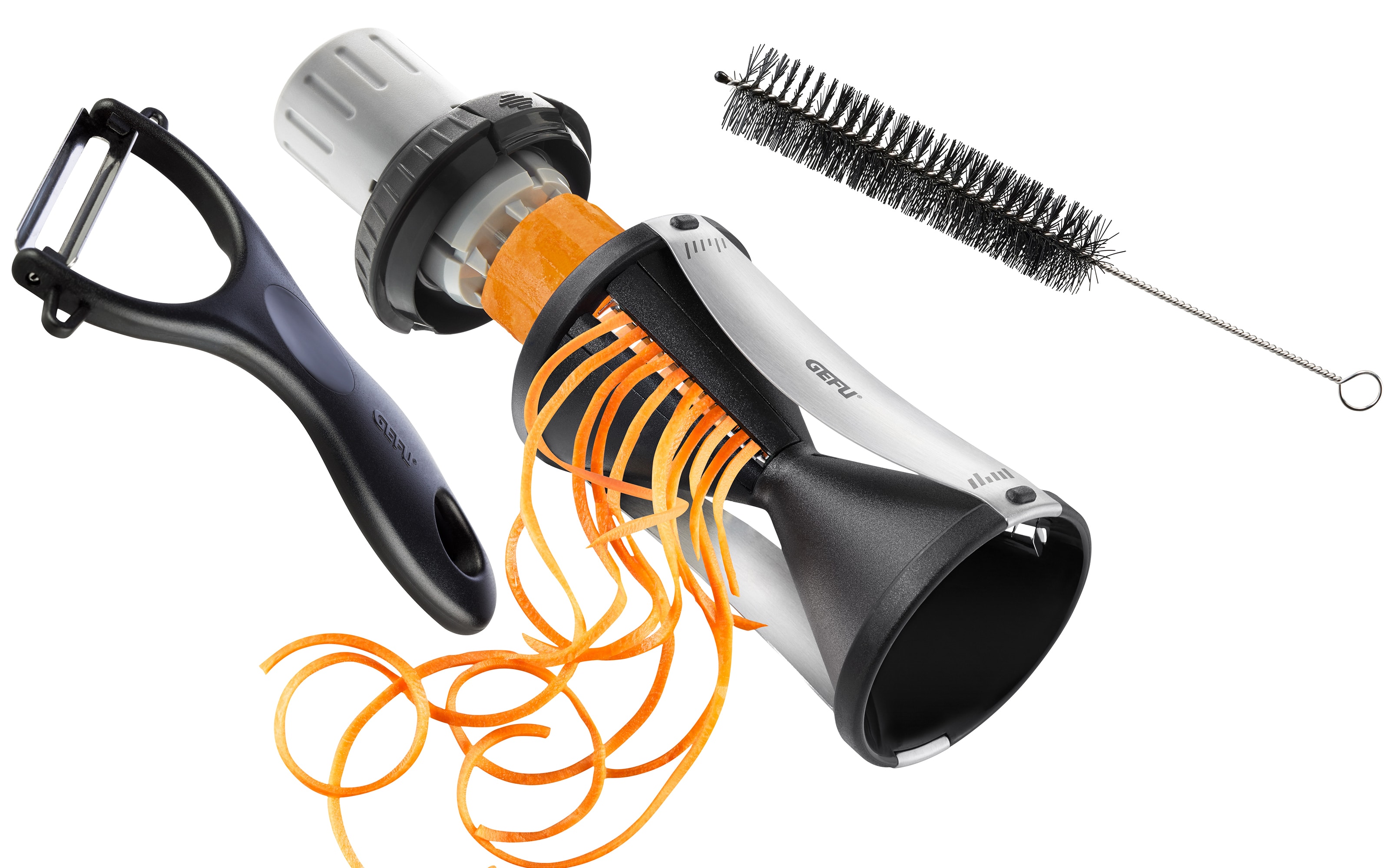 Für Julienne-Endlos-Spiralen mit Gemüsehalter, 2 Spiralformate: 2 x 3 mm und 3,5 x 5 mm, japanische Edelstahl-Spezialmesser, hochwertiger Kunststoff, spülmaschinengeeignet.