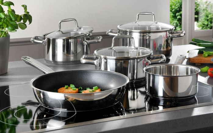 5-teiliges Topf-Set aus rostfreiem Edelstahl, für eine gute Wärmeverteilung und -speicherung, induktionsherdgeeignet.