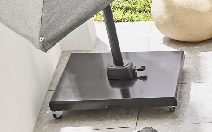 Ausführung in grauem Granit, durch die auf der Unterseite angebrachten Rollen ist er, obwohl er 90 kg Gewicht hat, bei Bedarf von einer Stelle zur anderen zu Rollen.