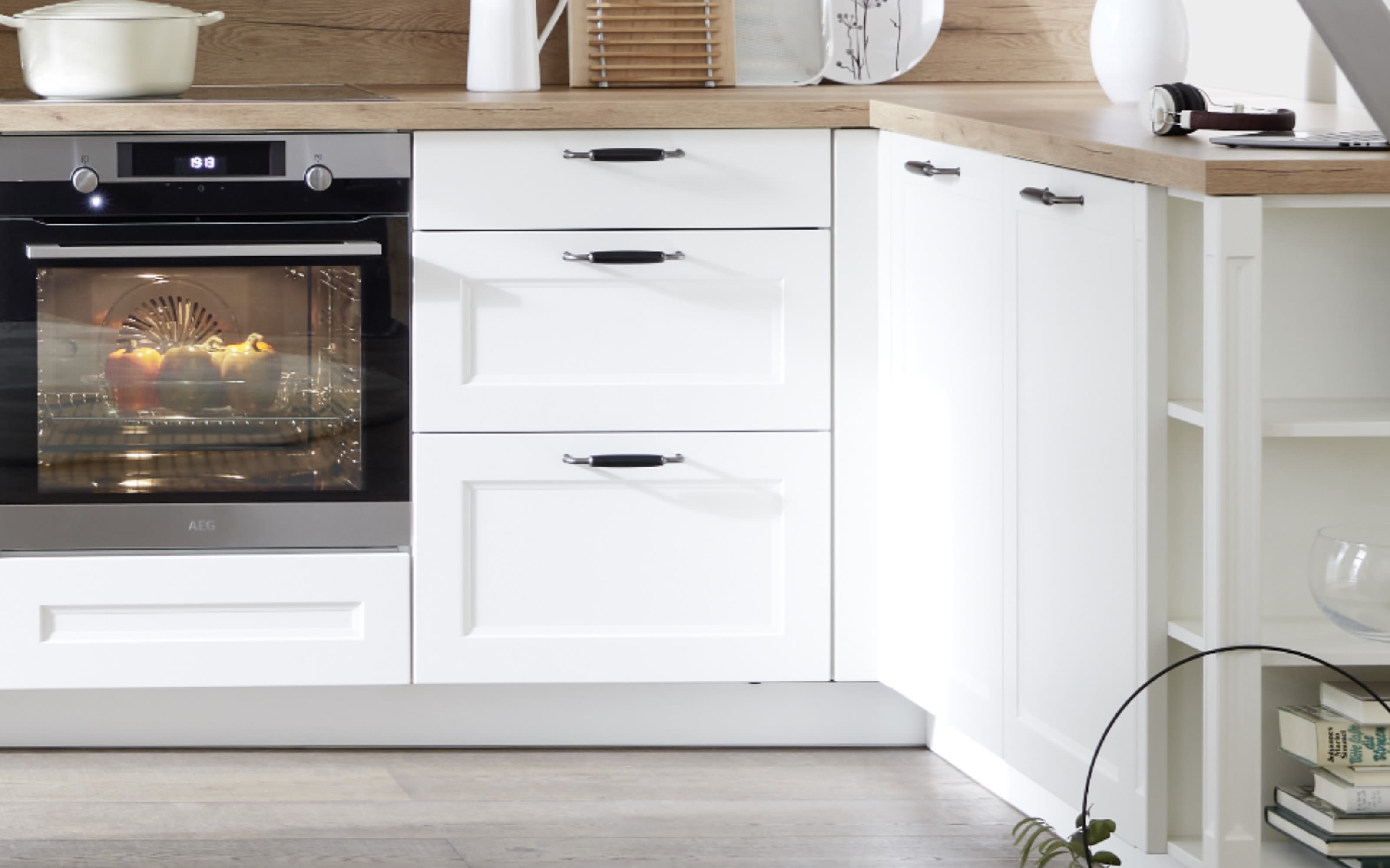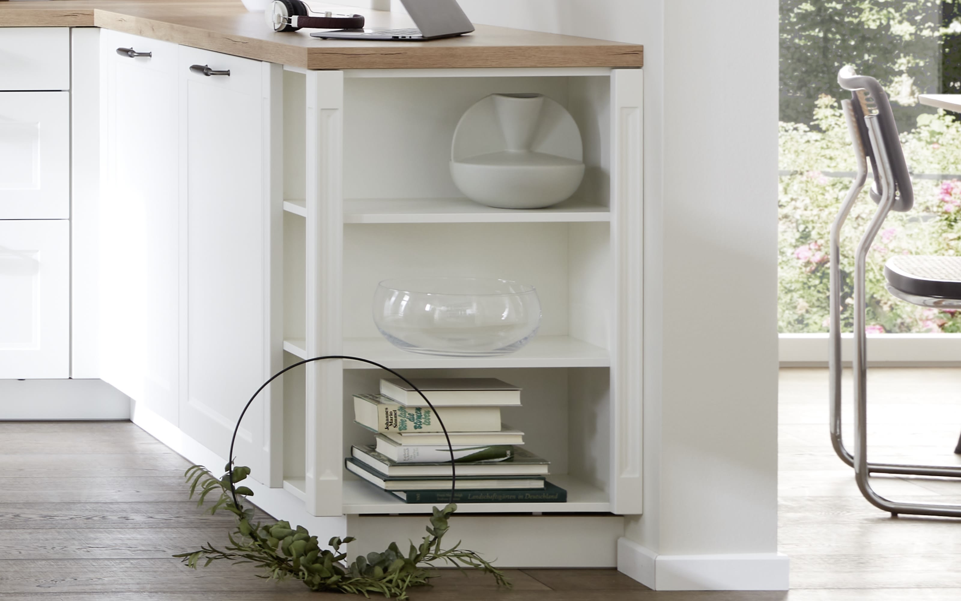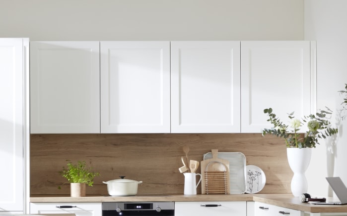 Ausführung Front und Korpus in weiß, Arbeitsplatte Eiche Montreal Nachbildung,