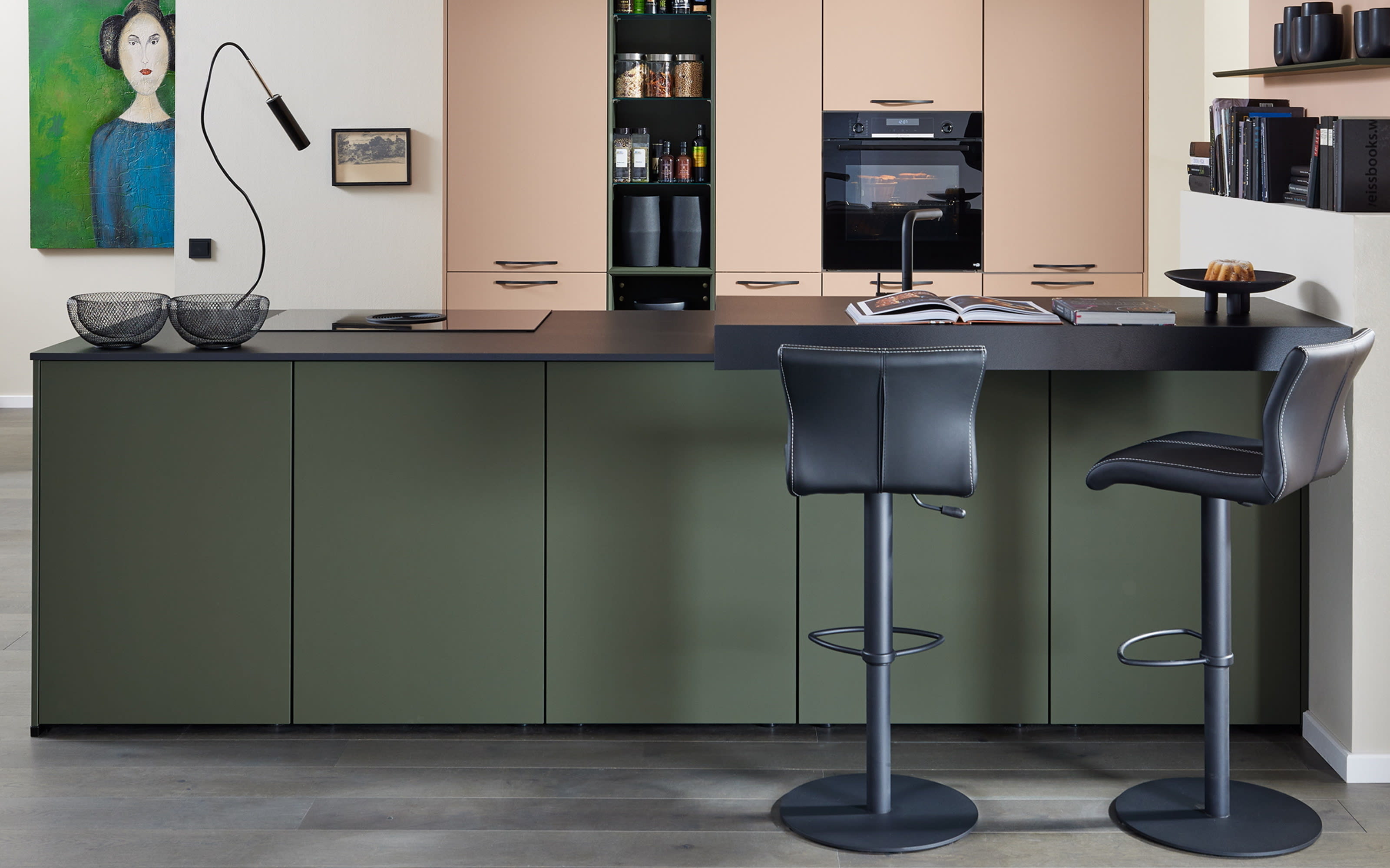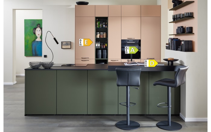Einbauküche Sunta/Esilia, mineralgrün/koralle, inkl. Miele Elektrogeräte
