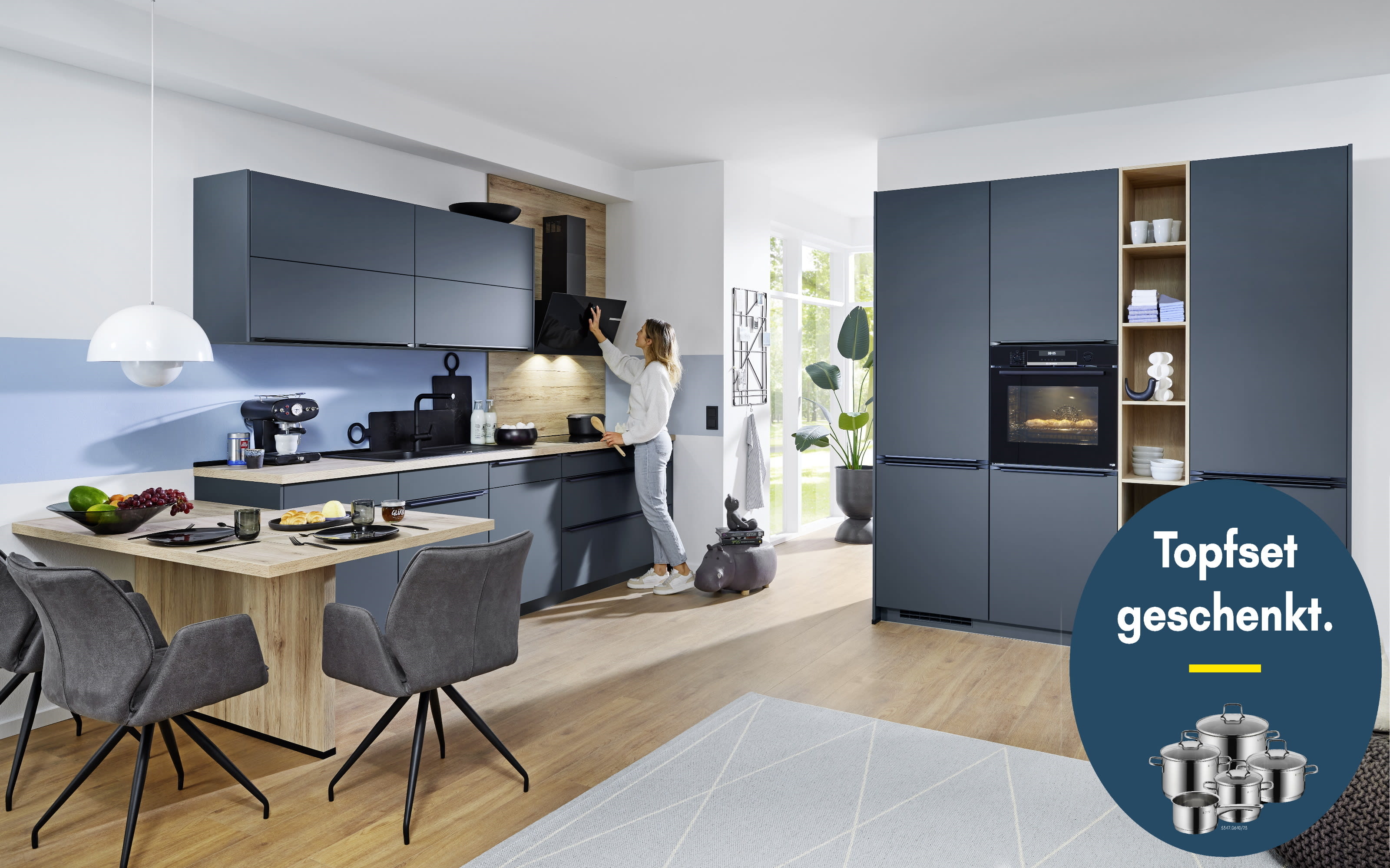Einbauküche Esilia, fjordblau, inkl. Miele Elektrogeräte