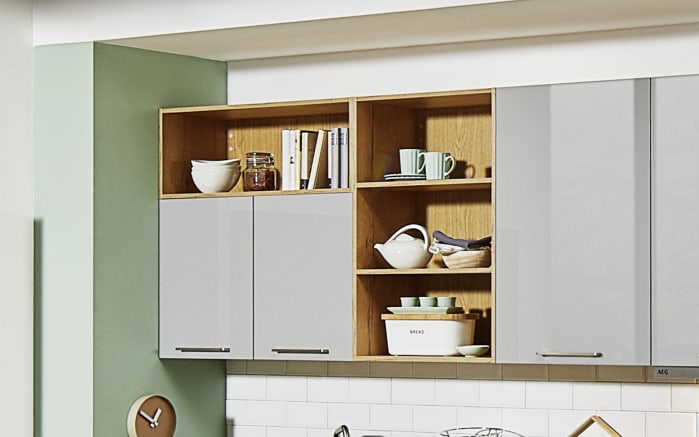 Ausführung Front und Tisch in perlgrau. Korpus, Absetzung und Arbeitsplatte Alteiche natur Nachbildung,