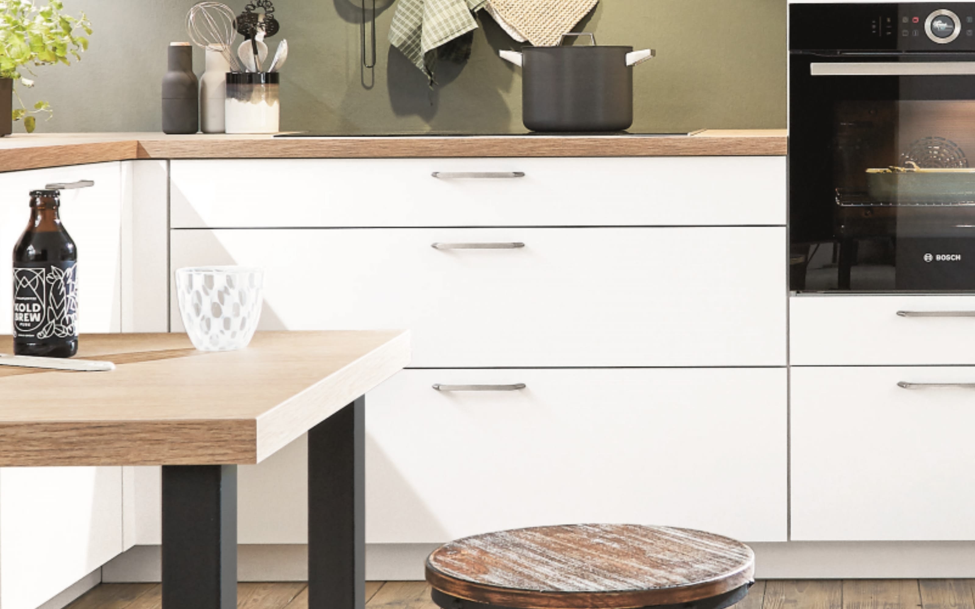 Ausführung in alpinweiß, Arbeitsplatte Eiche Soerset Nachbildung.