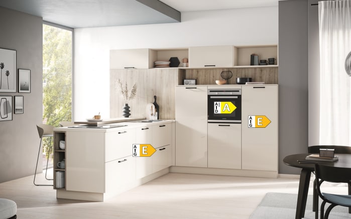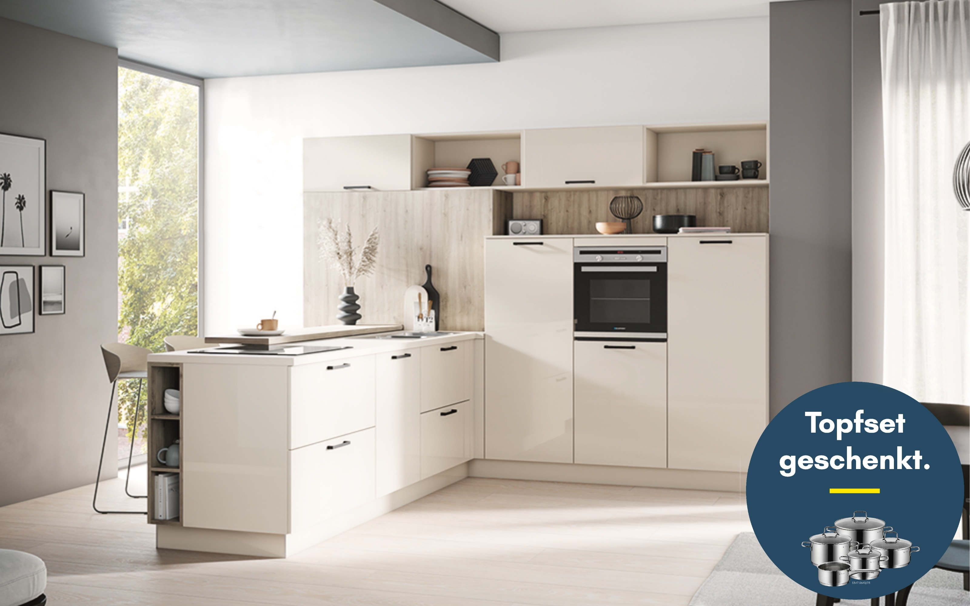 Einbauküche Perfect brillant, crema magnolia, inkl. Siemens Elektrogeräte