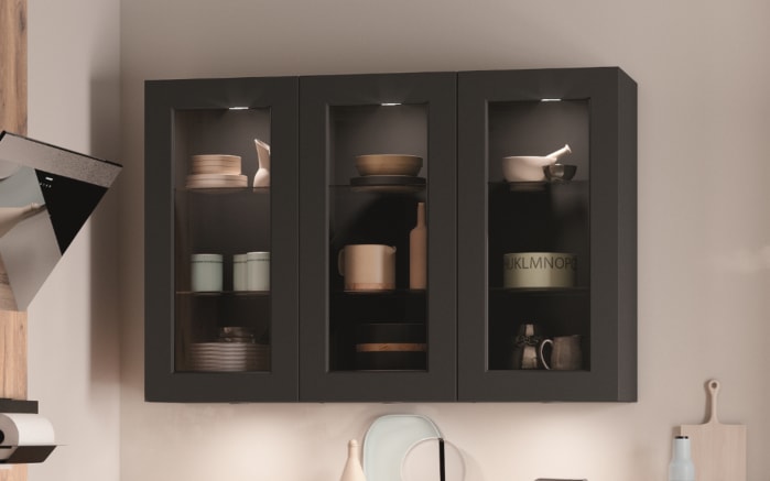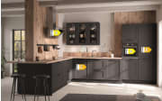 Front in schwarz matt, Korpus schwarz matt, Arbeitsplatte in Alteiche natur Nachbildung.