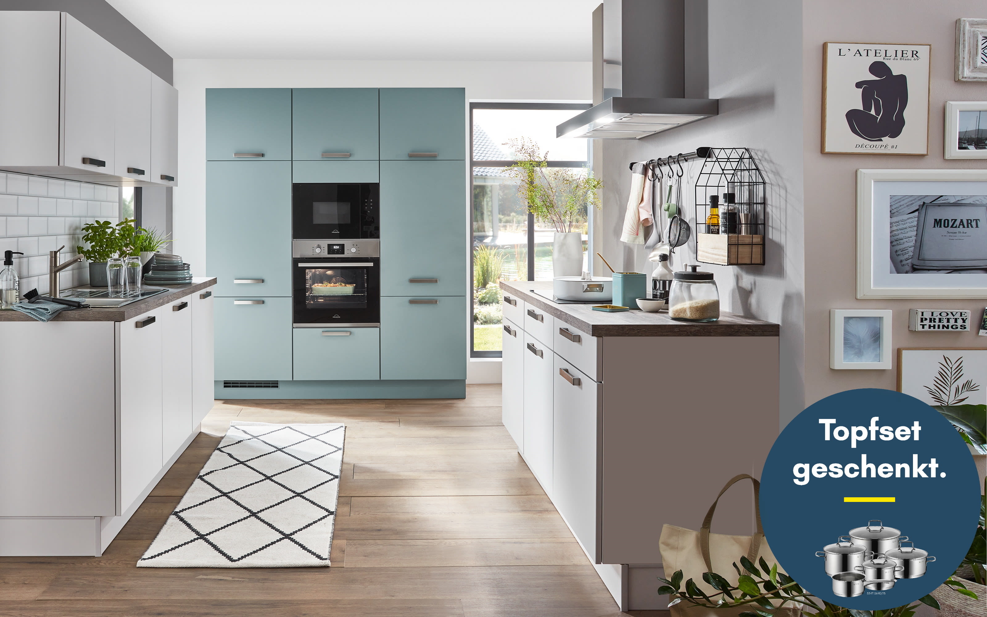 Einbauküche Torna, seidengrau/aqua, inkl. Elektrogeräte