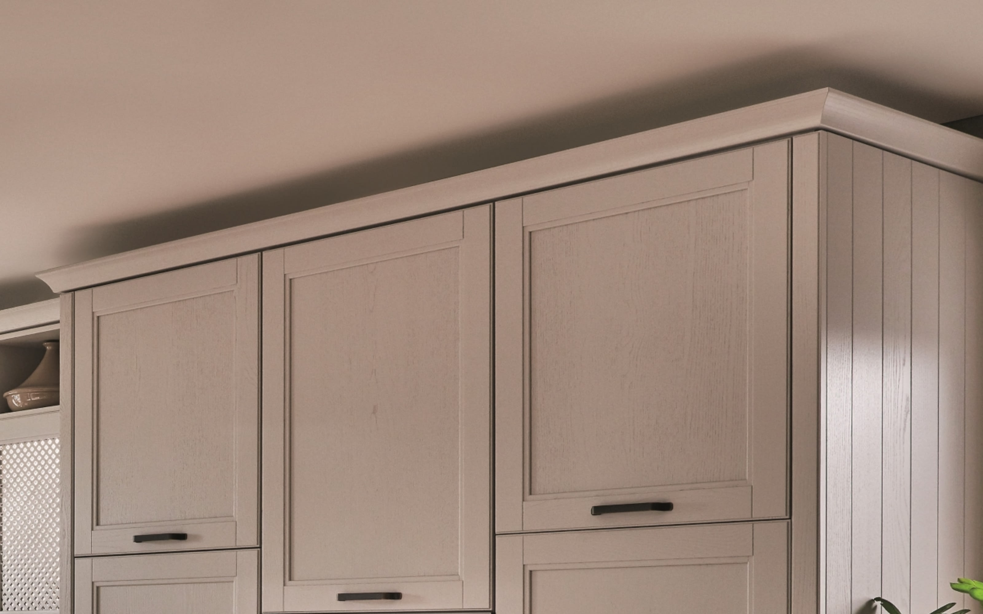 Front und Korpus Echtholz in seidengrau lackiert, strapazierfähig und leicht zu reinigen, Rahmentür mit Sprossen und Glaseinlage, Türinnenseite Frontfarbend lackiert,