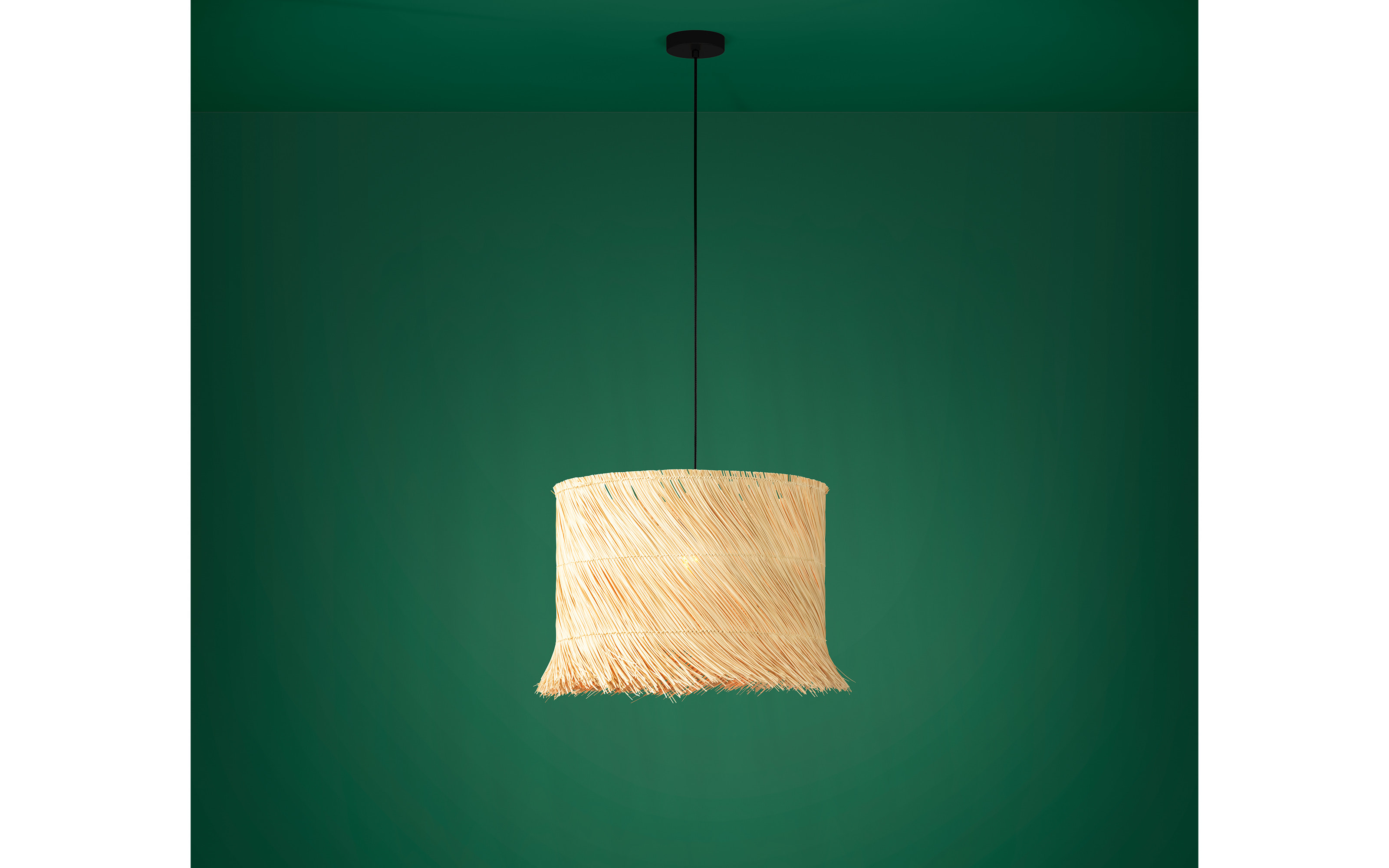 Die natürliche Pendelleuchte aus der Serie PAISANO überzeugt durch ihren Lampenschirm aus naturfarbigem Rattangeflecht,