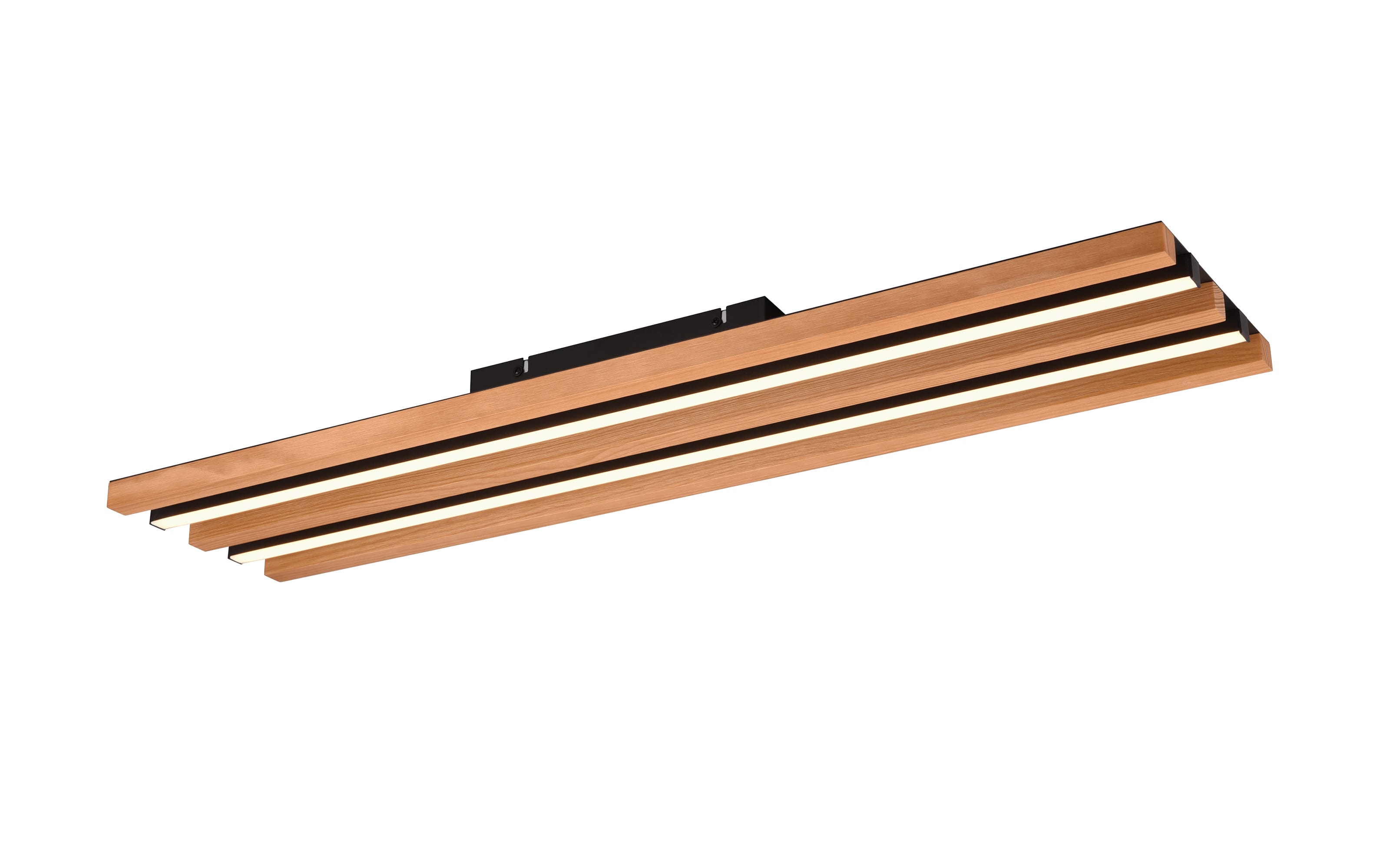 Die moderne LED-Deckenleuchte Fontana besteht aus naturbelassenen Holzpaneelen und aus Metall in Schwarz, matt, zeitlose Eleganz trifft auf warme natürliche Holztöne,