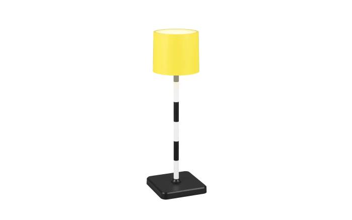 Ausführung mit Lampenschirm in Gelb, Säule in Schwarz/Weiß gestreift, Fuß in Schwarz, Lichtfarbe stufenweise einstellbar, mit praktischem Sensordimmer, diese Leuchte wird Akkubetrieben,