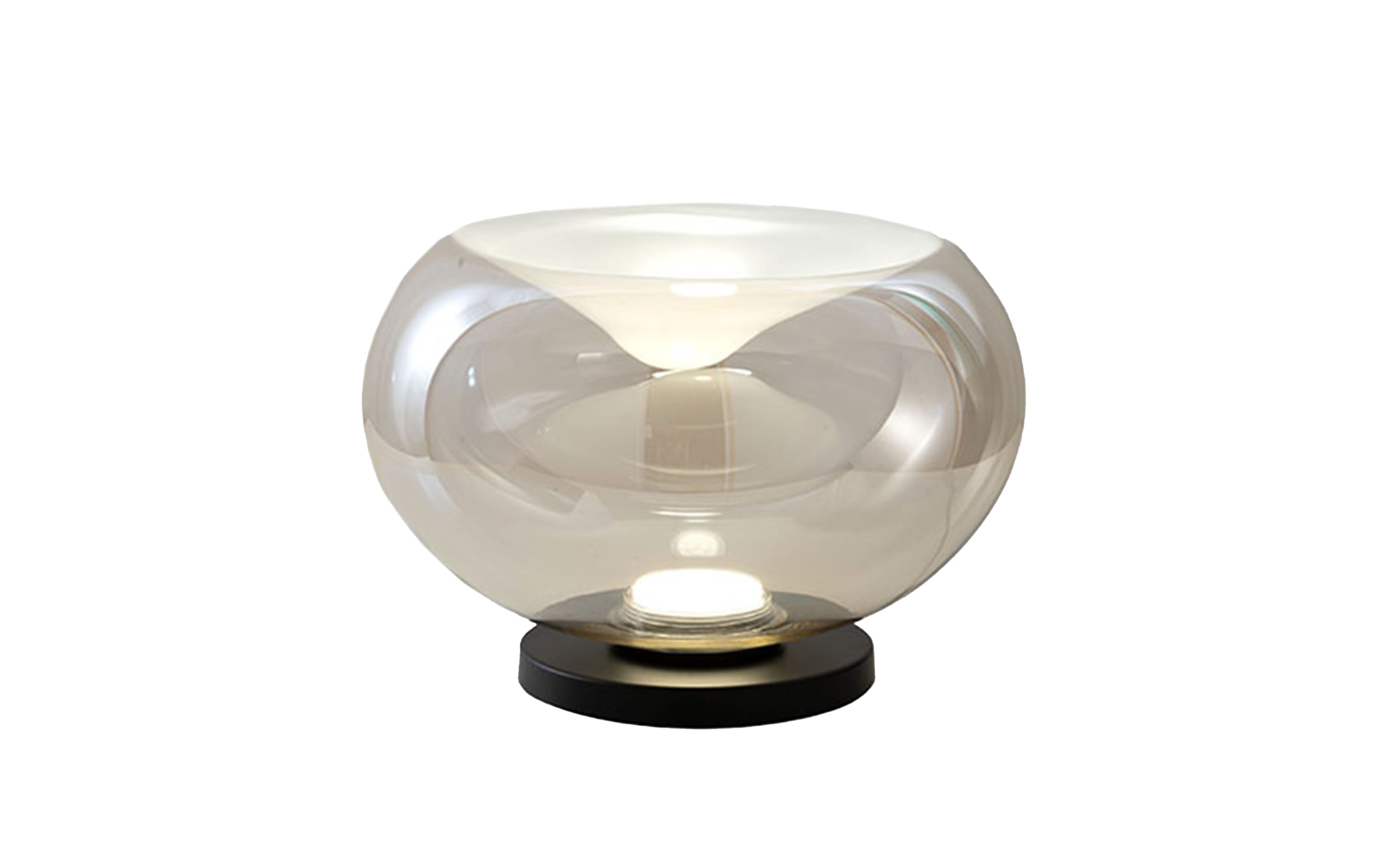Diese elegante LED-Tischleuchte hat einen Metallfuß in Schwarz, matt, der Lampenschirm besteht aus Borosilikatglas in einem modernen Cognac Farbton,