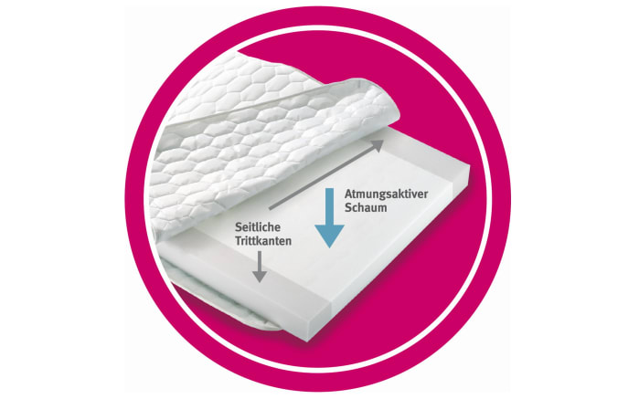 Matratze hat feste Trittkante an den Längsseiten. Liegefläche ca. 70 x 140 cm. Matratzengesamthöhe ca. 9,5 cm.