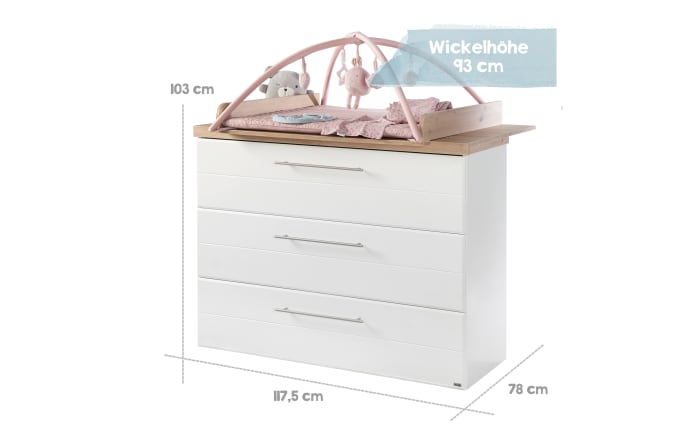 3 Schubkästen, oberste Schublade mit Vollauszug, mit Softclose Funktion, inklusive breitem Wickelansatz, links, rechts oder mittig montierbar und abnehmbar,