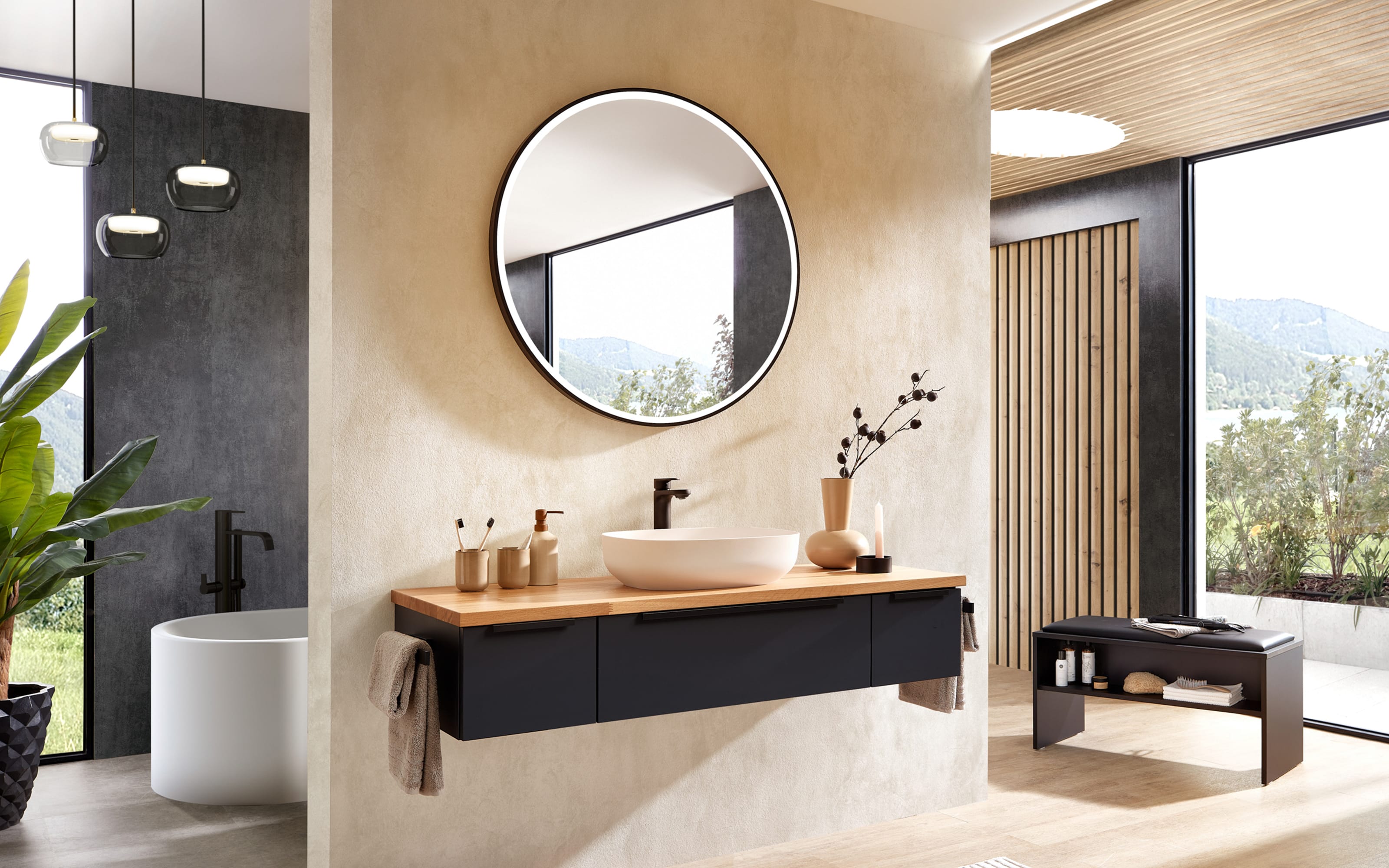 Badprogramm A-Plan Compact, schwarz/Eiche massiv, inkl. LEDplus-Effektlicht