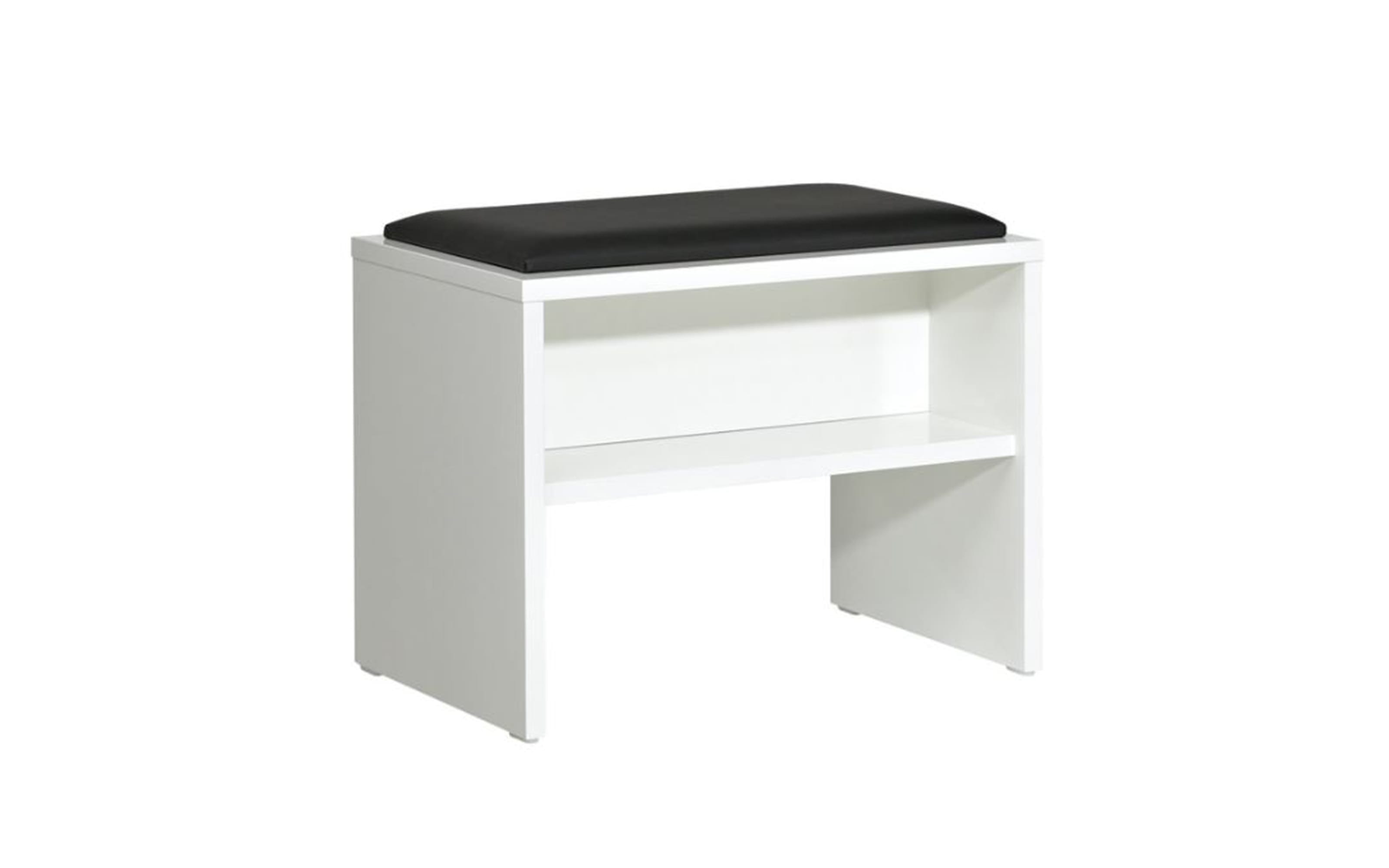 Ausführung mit Korpus und Front in Weiß, Glanz, mit Ablagefach und Sitzkissen in Schwarz,