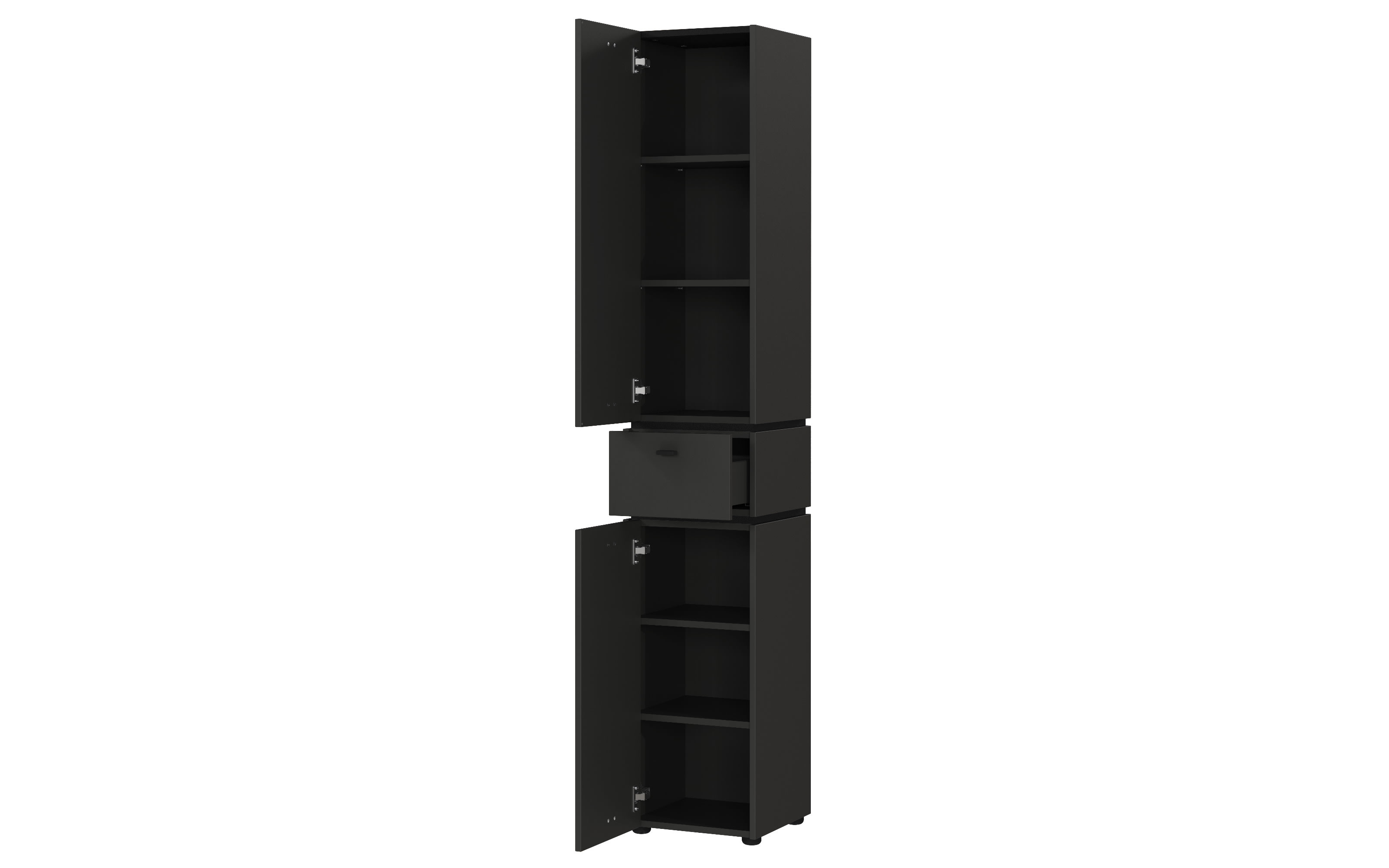Korpus und Front mit Melaminharzbeschichtung in graphit, Oberboden in Balkonoptik Absetzung in schwarz.