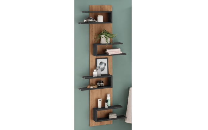 Ausführung mit Front und Korpus in Cuneo Eiche-Nachbildung braun, 4 überstehende offene Regalfächer, mit sicheren ABS Kanten,