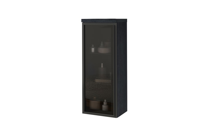 Ausführung mit Korpus aus Eiche in Schwarz, 1 Glasrahmentür mit Rauchglas in Anthrazit, 2 Glasfachböden, Melaminharzbeschichtet mit ABS-Kanten, mit Griffleiste,