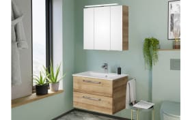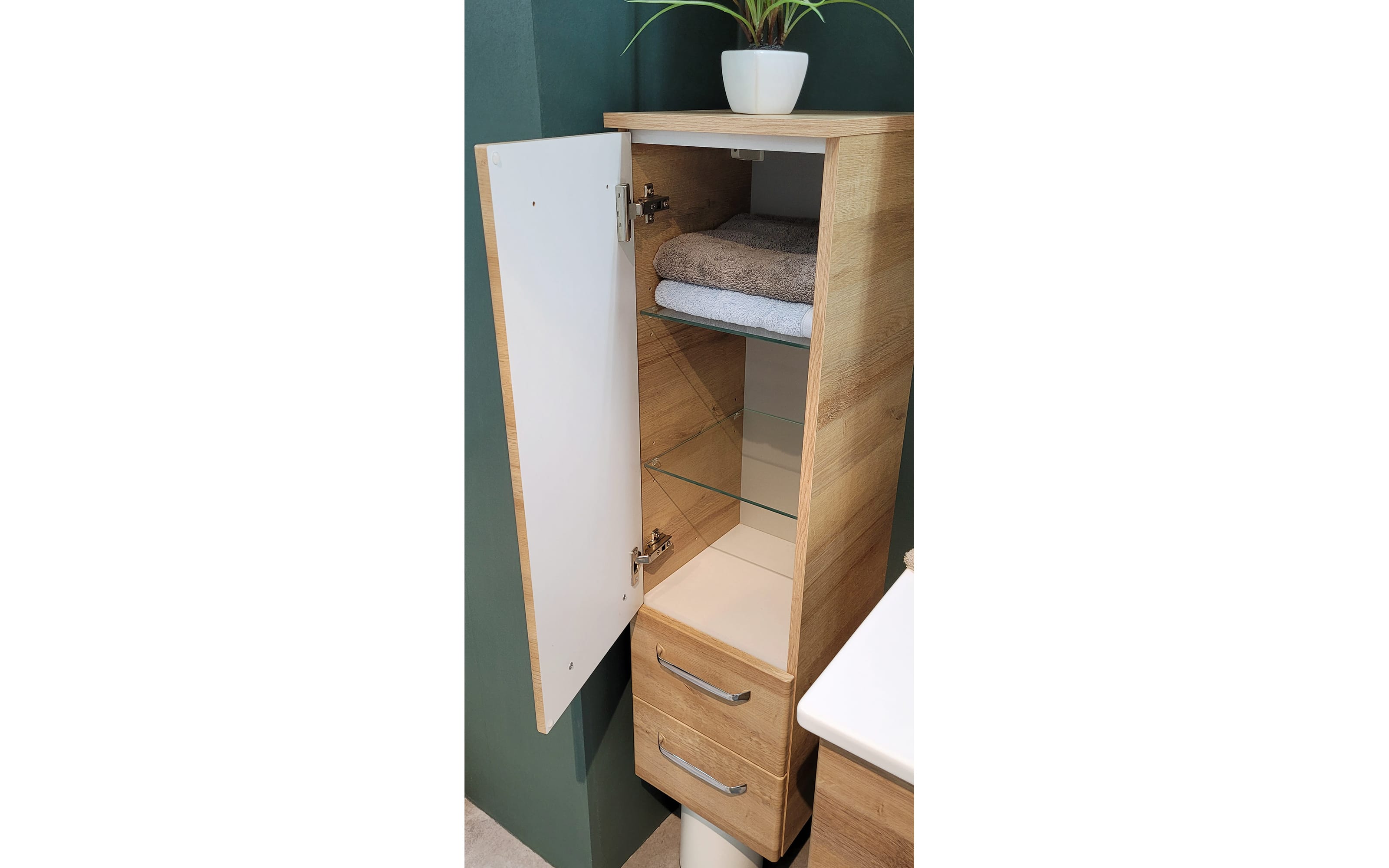 Ausführung mit Front und Korpus in Eiche-Nachbildung, quer, Griffe in Chrom, 1 Drehtür, 2 Schubkästen, 2 Einlegeböden,