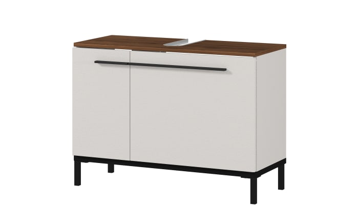 Moderner Waschbecken-Unterschrank mit Front und Korpus in Kashmir, matt, Top in Nussbaum-Nachbildung, Füße und Griffe aus Metall in Schwarz,