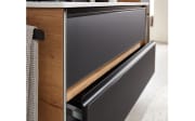 Ausführung mit Front aus Glas rückseitig in matt schwarz lackiert, auf Trägerplatte, mit Kunststoffkante in Glas-Nachbildung, Korpus in Eiche Halifax-Nachbildung, Griffleiste in alufarbig,
