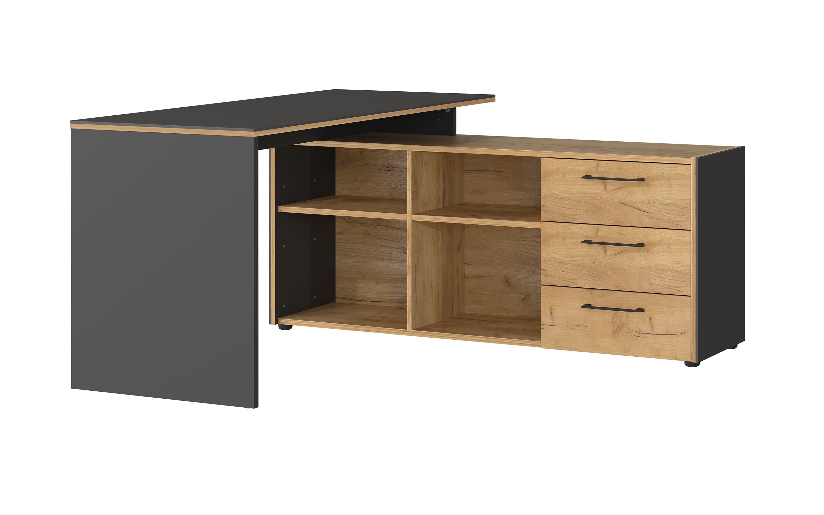 Front und Abdeckplatte in Eiche Navarra Nachbildung, Korpus und Schreibplatte in graphit matt Melaminharzbeschichtet, Bügelgriff aus Metall in silber matt, inklusive integriertem Sideboard, links oder rechts im 90° Winkel montierbar, 3 Schubkästen mit Selbsteinzug, 4 offene Fäscher und stoßfeste ABS-Kanten, B/H/T ca. 147 x 75 x 145 cm.