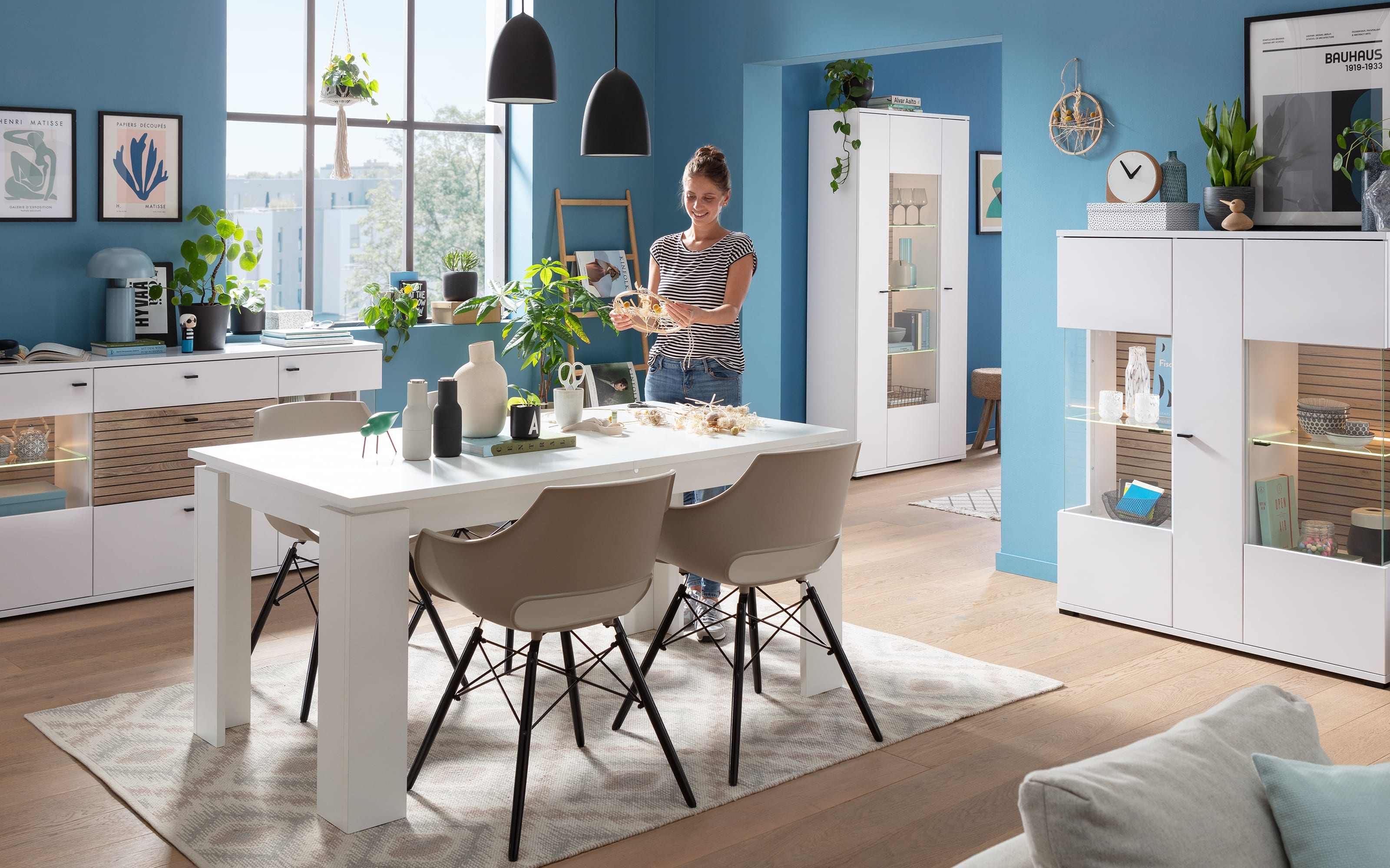 Ausführung mit Front und Korpus in weiß, mit ausziehbarer Tischplatte, Füße mit Kunststoffgleiter,