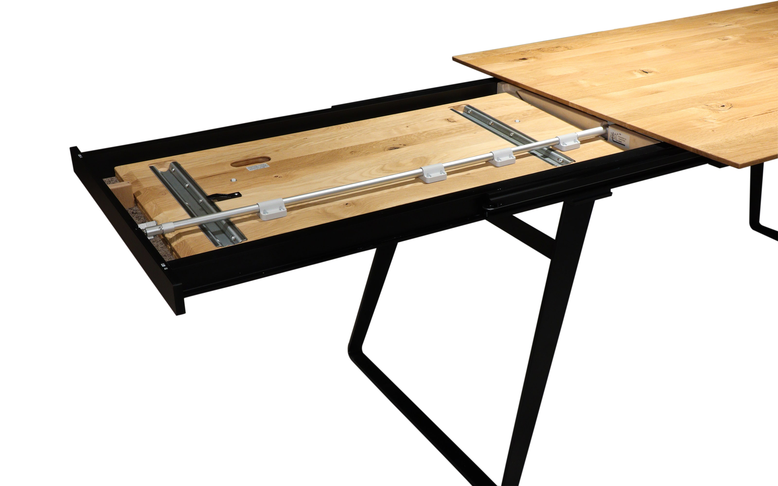 Ausführung in Charaktereiche massiv geölt, Bügelgestell Roheisen geschwärzt, inklusive mit Synchron-Schiebeplatte,