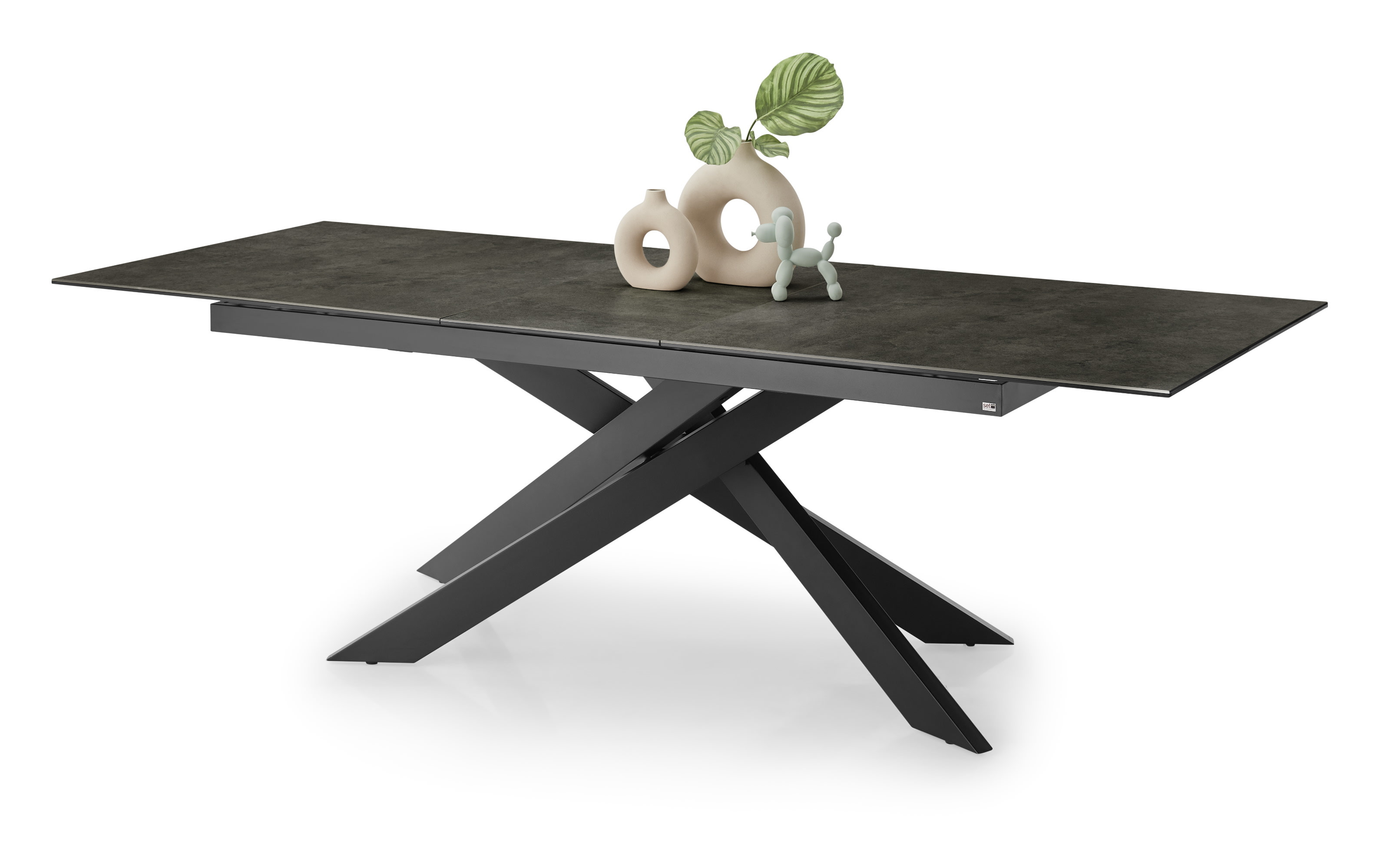 Ausführung Tischplatte aus Glas-Keramik in Schwarz, Gestell Kreuzfuß aus Stahl in Schwarz mit Schmetterling Auszug,