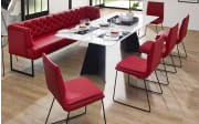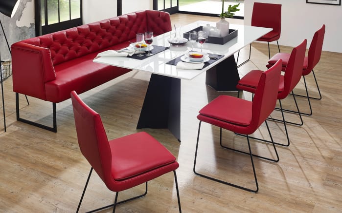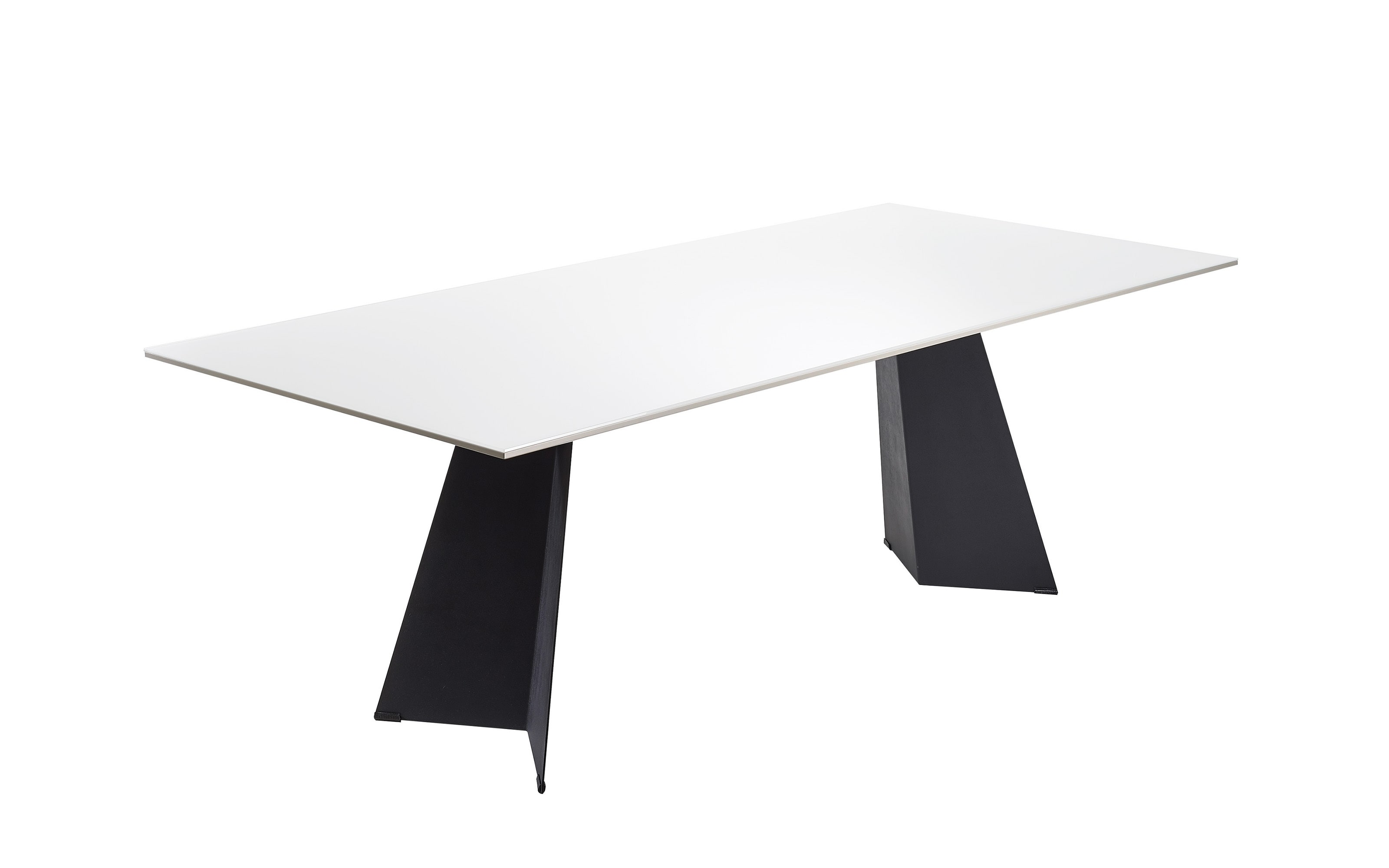 Esstisch mit Glasplatte in weiß, formschöne Metallfüßen in schwarz.
