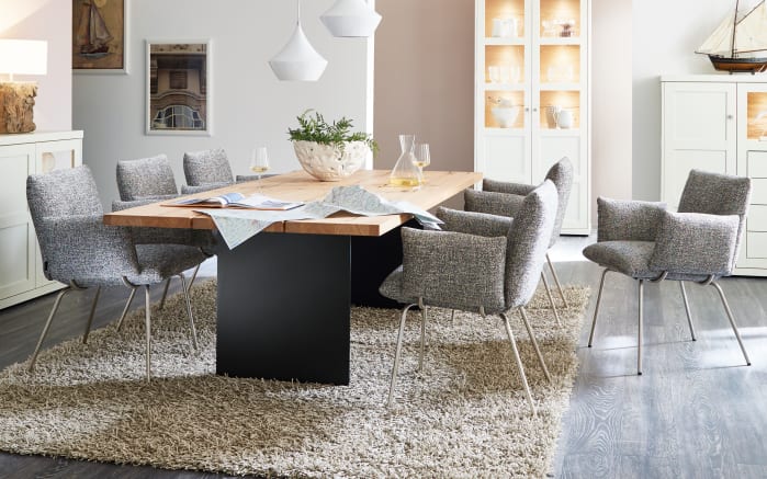 Ausführung mit Tischplatte aus Santana-Eiche hell geölt und furniert, Gestell aus Metall in matt schwarz.