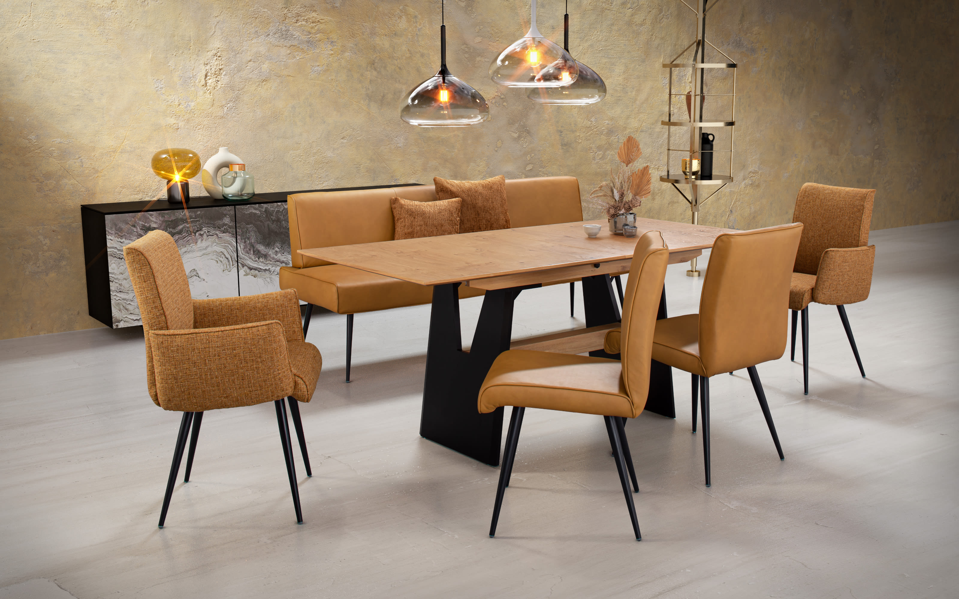 Ausführung der Tischplatte in Asteiche natur furniert, Füße aus MDF in schwarz, inklusive Synchronauszug,