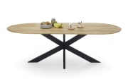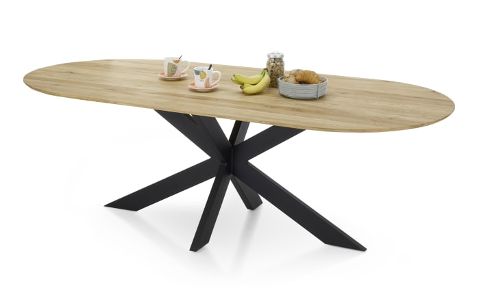 Ausführung der Tischplatte aus massiver Eiche,  Platte Ellipse mit Schweizer Kante, formschönes Gestell aus Metall in schwarz.