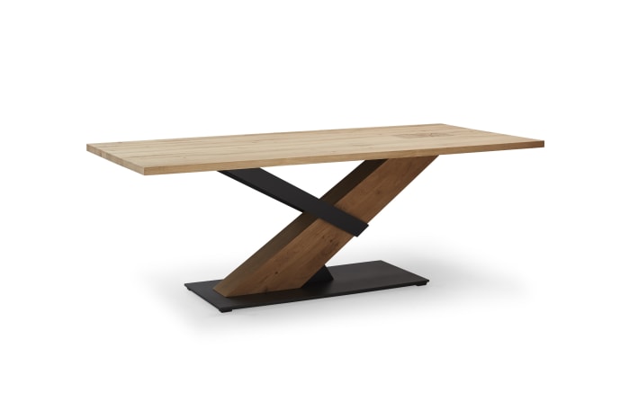Ausführung der Tischplatte in Kerneiche Natur massiv, Hirnholz Absetzung, formschönes Gestell aus Kerneiche Natur massiv und Metall in anthrazit,