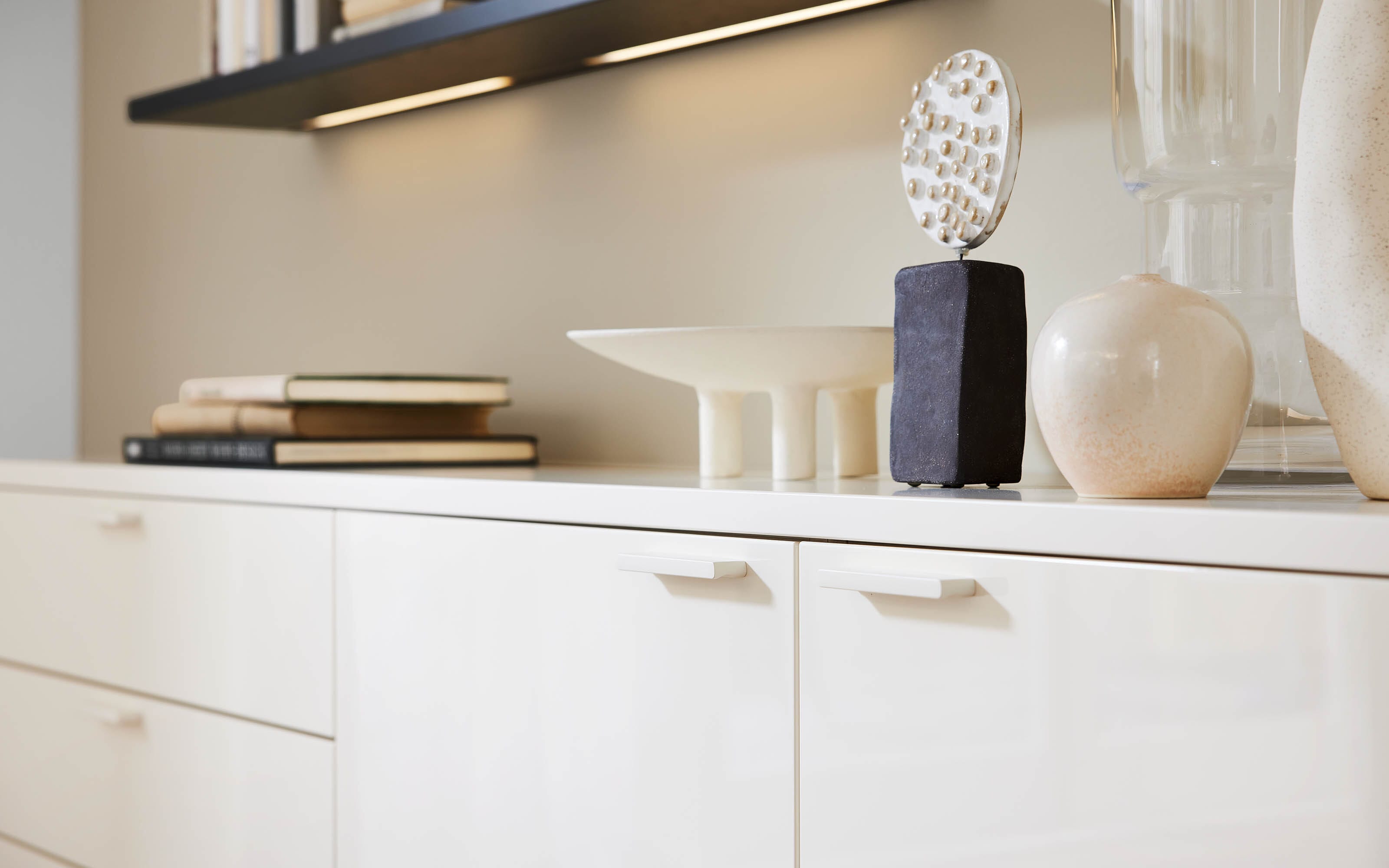 Ausführung mit Front aus Holz in Hochglanz wollweiß, 3 Schubkästen, 2-türig, 2 Einlegeböden für optimale Stauraumnutzung,