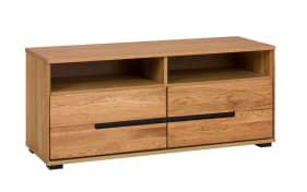 Ausführung der Front in Eiche massiv, Korpus in Eiche furniert, 3 Holztüren, 1 Glastür mit Alurahmen in schwarz,