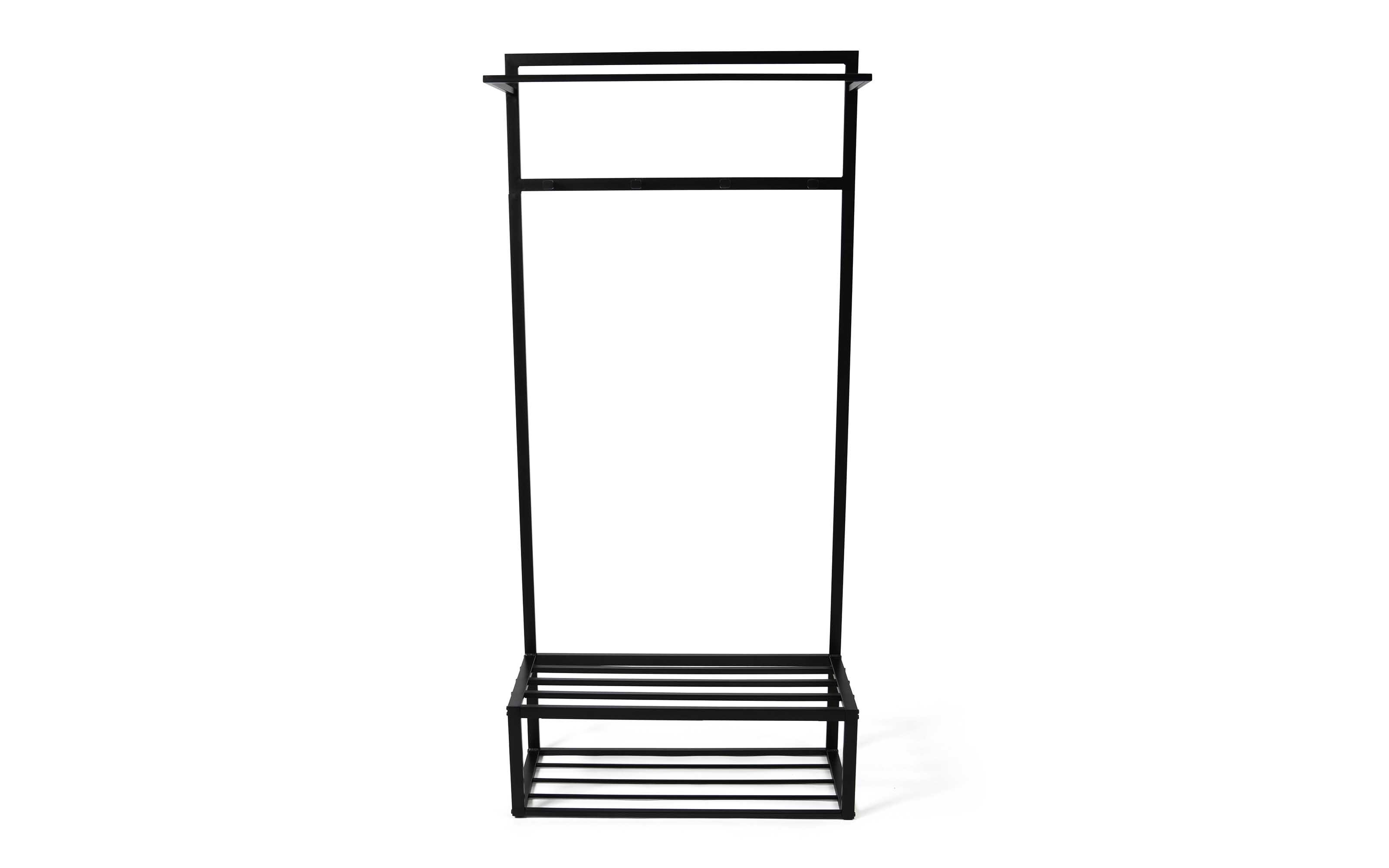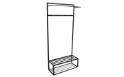 Ausführung mit Gestell aus Metall in schwarz lackiert, 2 Ablageflächen für Schuhe, 2 Kleiderstangen für Jacken, Mäntel und Co.